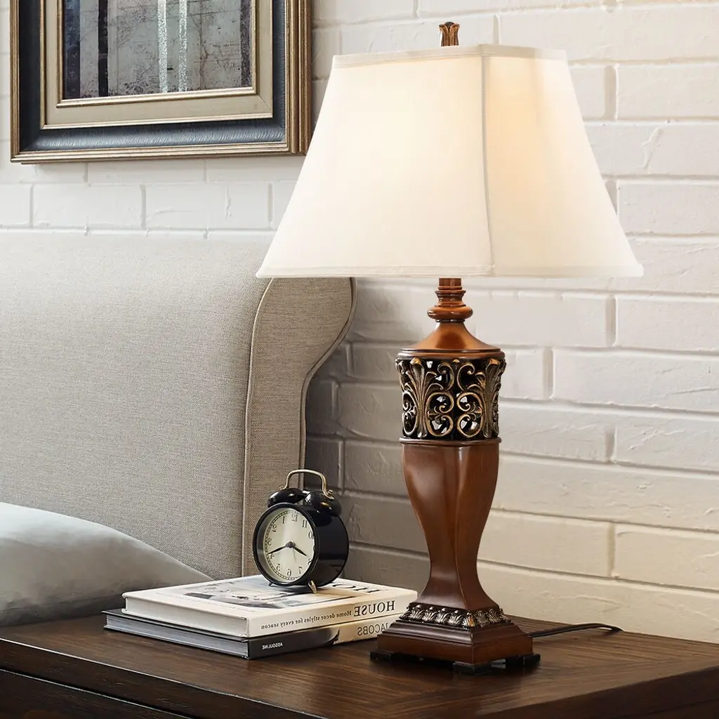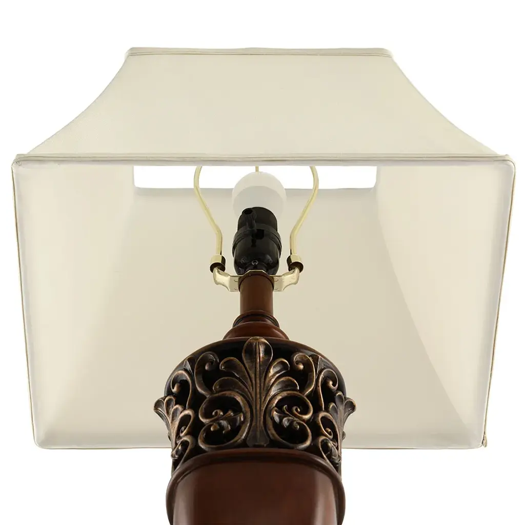 Bring a touch of elegance to your rustic decor with these 30 in. tall table lamps. The elongated shades snug up against the wall, saving space on your nightstand while providing useful reading light at either bedside or sofa. The lamp base boasts a superior quality, 2-tone finish with carved leaf detailing that complements any decor from contemporary to classic.Features:Other sections: