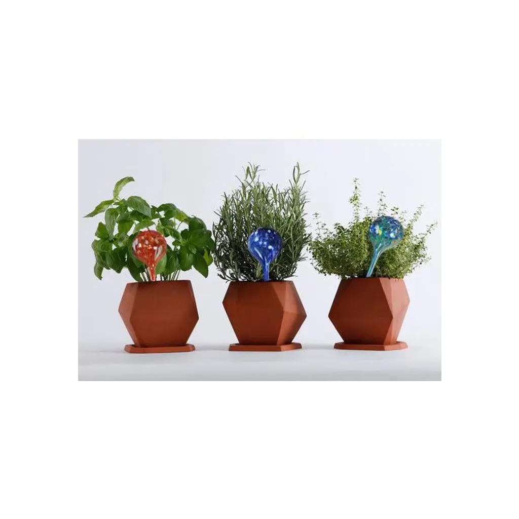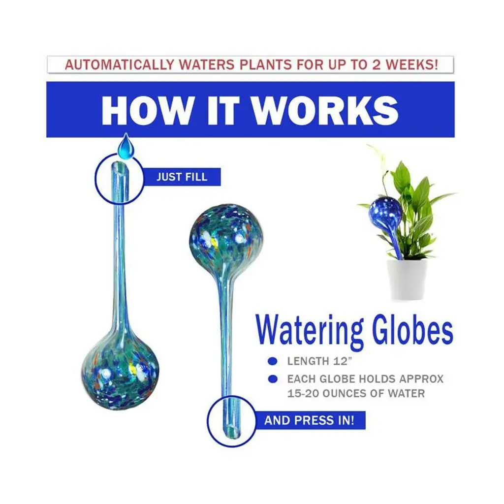 Automatic Glass Watering Globes Your Personal Plant CaretakerMade of high-quality glass, these watering globes provide an efficient and effortless way to keep your potted flowers, houseplants, and herbs hydrated while you're away on vacation. With their automatic self-watering system, these bulbs release water gradually as your plants need it, ensuring that they stay healthy and well-hydrated for up to 2 weeks at a time.. Hand Blown Durable Decorative Glass BulbsMulti-Colored, Hand-Blown, and Decorative, these glass watering globes are not just functional, they also add a touch of beauty to your indoor or outdoor garden décor. With a thicker glass design, these bulbs are durable enough to withstand any handling and keep your plants safe from harm.Watering Bulbs Are Easy to Use and VersatileOur aqua glass plant watering globes are incredibly easy to use. Simply fill the bulbs with water and insert them into the soil near the roots of your plants. The bulbs will gradually release water into the soil as your plants need it, keeping them hydrated and healthy even if you're not there to tend to them. These globes are perfect for a wide range of plants, including potted flowers, houseplants, and herbs, and they can be used both indoors and outdoors.Watering Globes Are Efficient and Effective Automatic Plant CareAutomatic self-watering plant bulbs feature drip control insert for soil moisture and a Water Feeder Globe. Making these globes an ideal watering tool for your plants. Its self-watering insert ensures that your plants get enough water without drowning them. The drip control system regulates the amount of water that gets released into the soil, giving your plants the perfect amount of moisture to grow. The efficient release of water ensures that your plants stay hydrated without being overwatered or underwatered, which can lead to unhealthy and wilted plants. With these watering globes, you can be confident that your plants are getting the care they need to thrive.Easy To Use Convenient Drip Irrigation SystemNo need to worry about over or under-watering your plants with these convenient drip irrigation watering globes. They provide a slow release of water, which keeps the soil evenly moist and your plants hydrated. Small Watering Globes are 6" in length and hold approx 5-8 oz's of water.