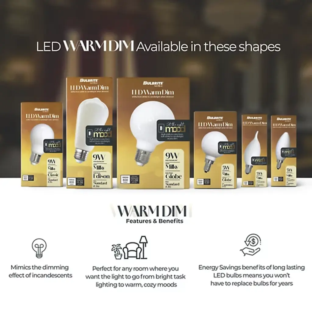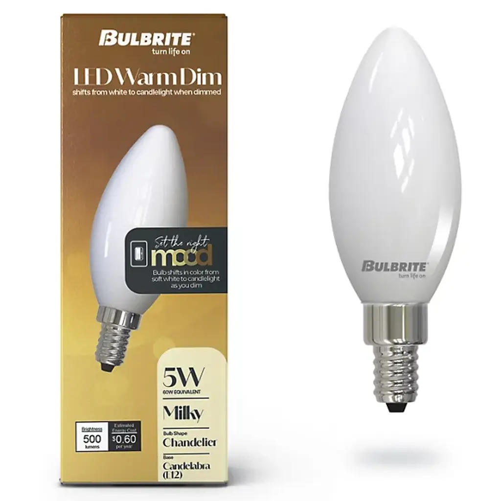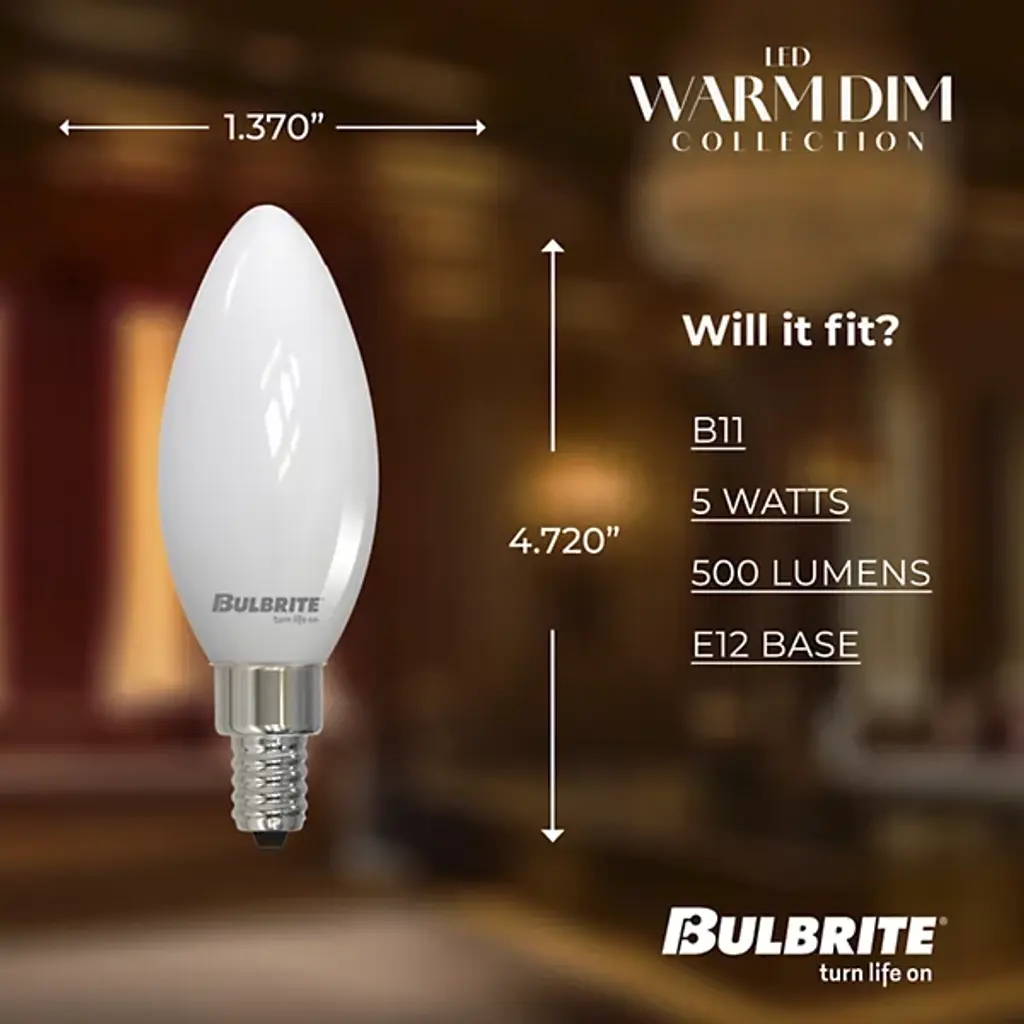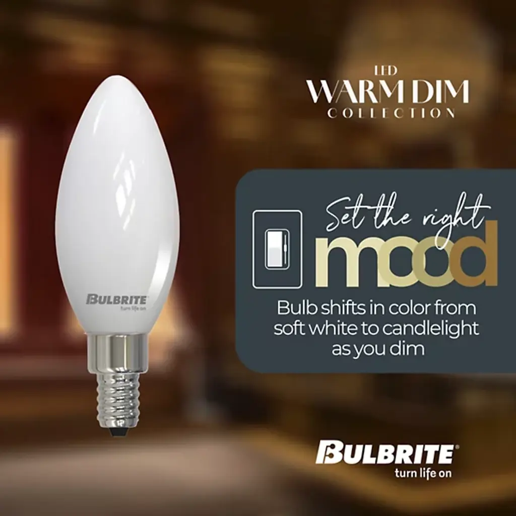 The Bulbrite 5W 120V B11 E12 LED Warm Dim White Bulb from Bulbrite offers the cozy glow of incandescent bulbs when dimmed, with the energy efficiency of LEDs. These 5-watt B11 torpedo-shaped glass bulbs cast the perfect hue throughout your home, from dim to warm. Featuring a clear filament, milky glass finish, and an E12 candelabra screw base, they are long-lasting and compatible with dimmer technology and fixtures.