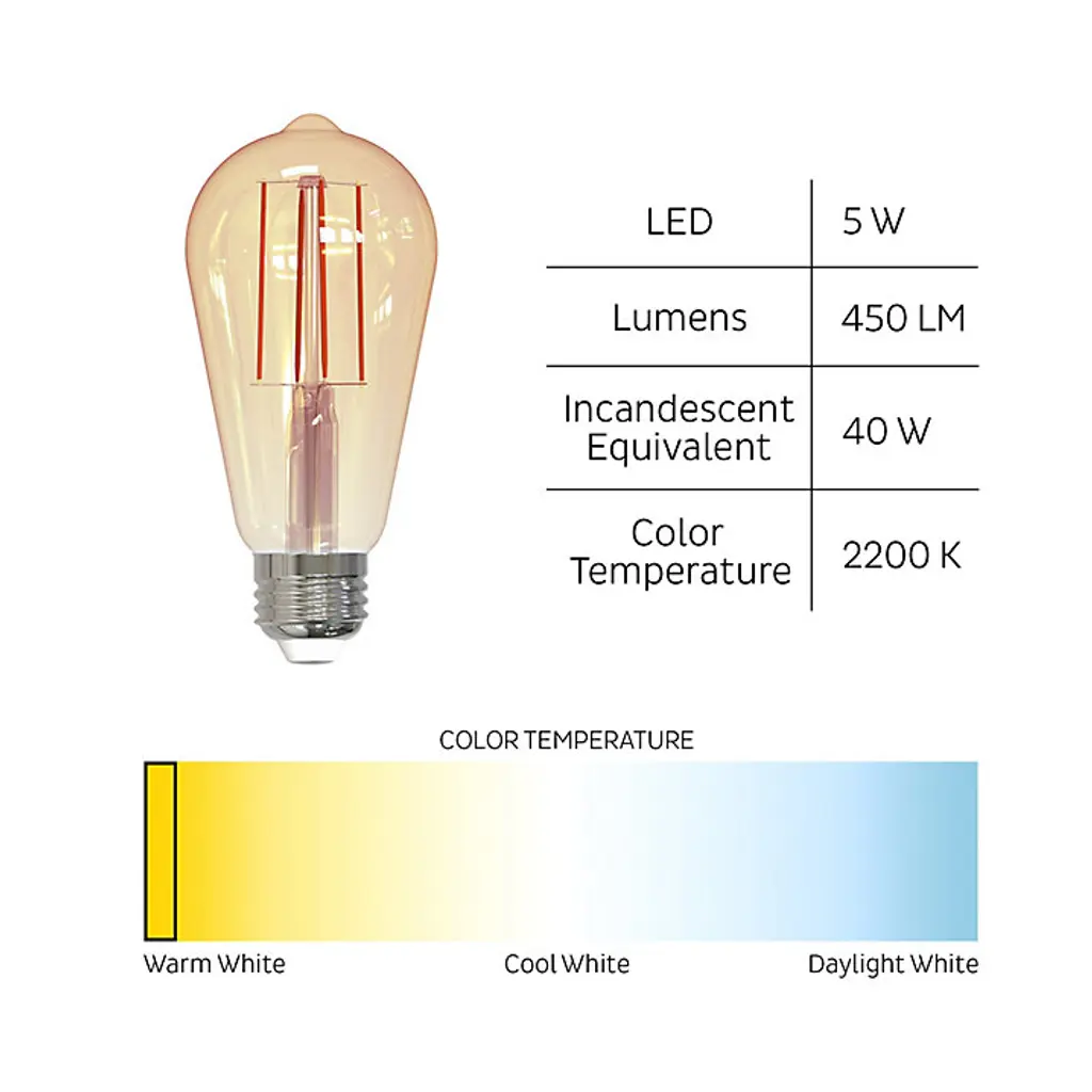 Designed to capture the look and warmth of a vintage incandescent light, our LED Nostalgic Dimmable Light Bulb features a bar filament showcased in antique finish glass. Made to last an average of 15,000 hours, it's fully compatible with all dimmer types and rated for wet locations. 5W LED Nostalgic Dimmable Light Bulb features: Learn More About Choosing Your LED Bulb Type