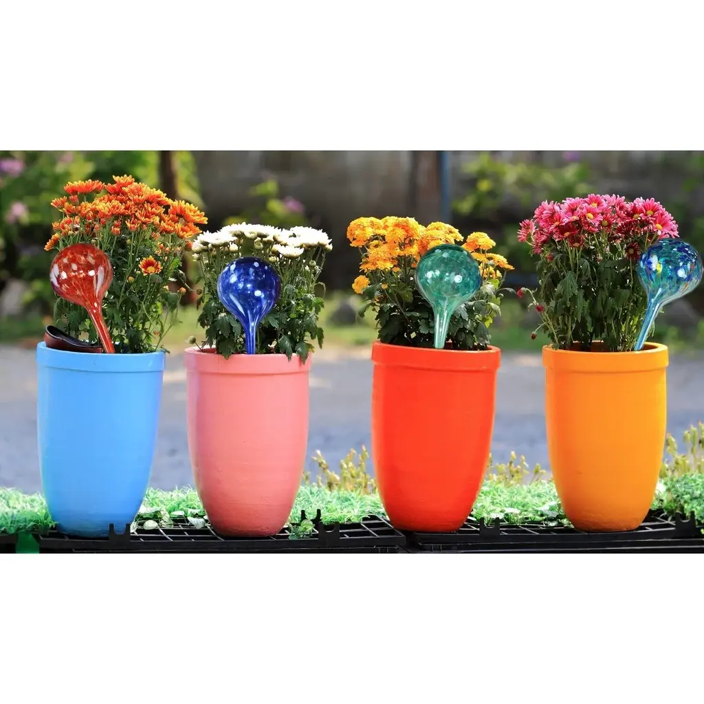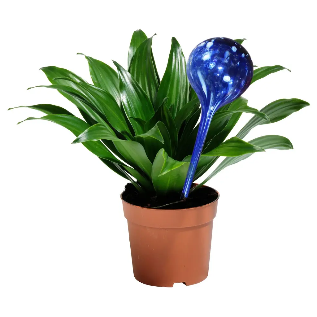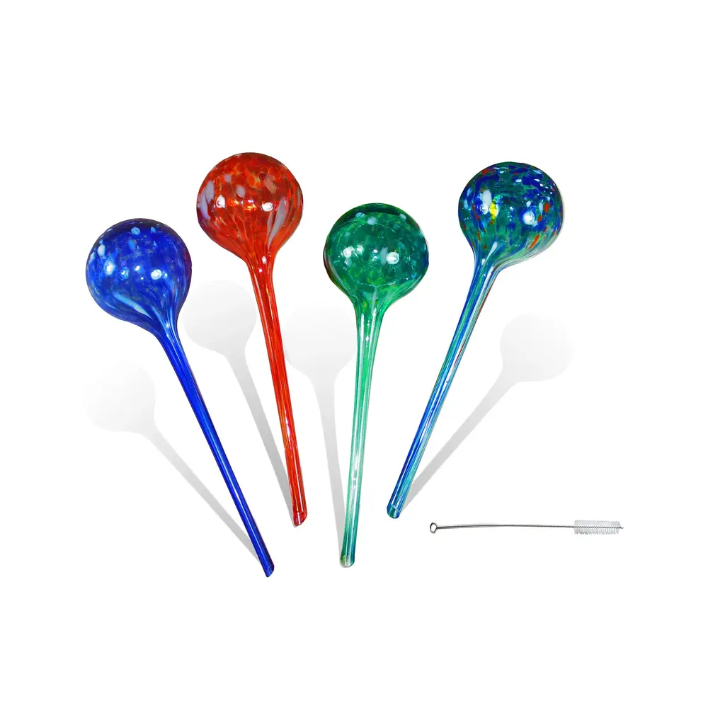 Automatically Water Your Plants Watering Globes water your plants even when you forget! The perfect alternative to daily watering, it waters plants automatically. Plus, no spills to clean up and no more over-watering. Gorgeous hand blown stained glass Water Globes dispenses water as plants need it, every time. Beautiful hand blown glass balls provide an automatic drink to indoor and outdoor potted plants, for up to 2 weeks at a time. Just fill with water and insert into the soil—it’s that easy! As soil becomes dry, it releases oxygen into the Watering Globes, which in turn release the exact amount of water the plant needs. Length 12" - Each globe holds approx 20 approx oz's of water for large. The small globes are 6" in length and hold approx 5-8 oz's of water.