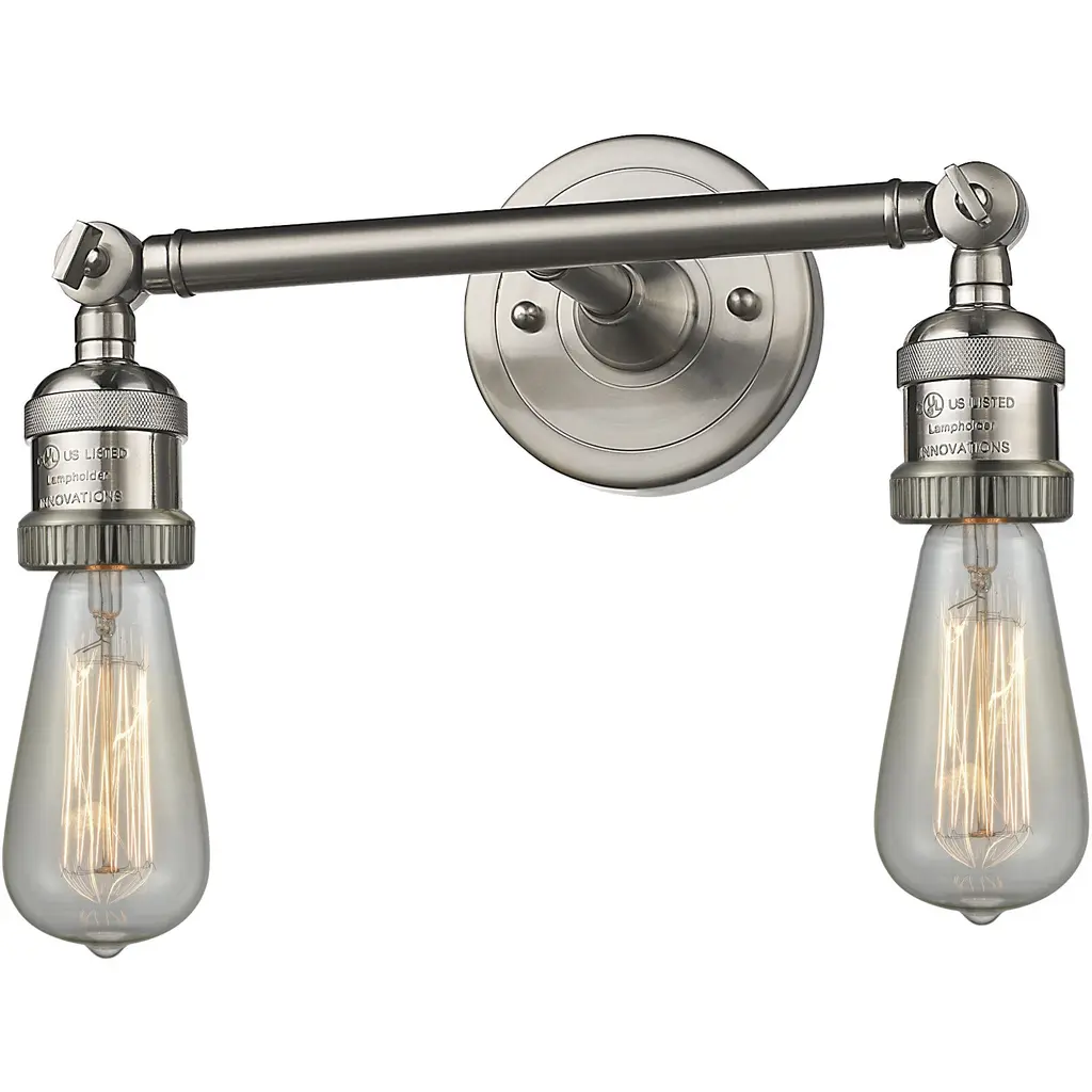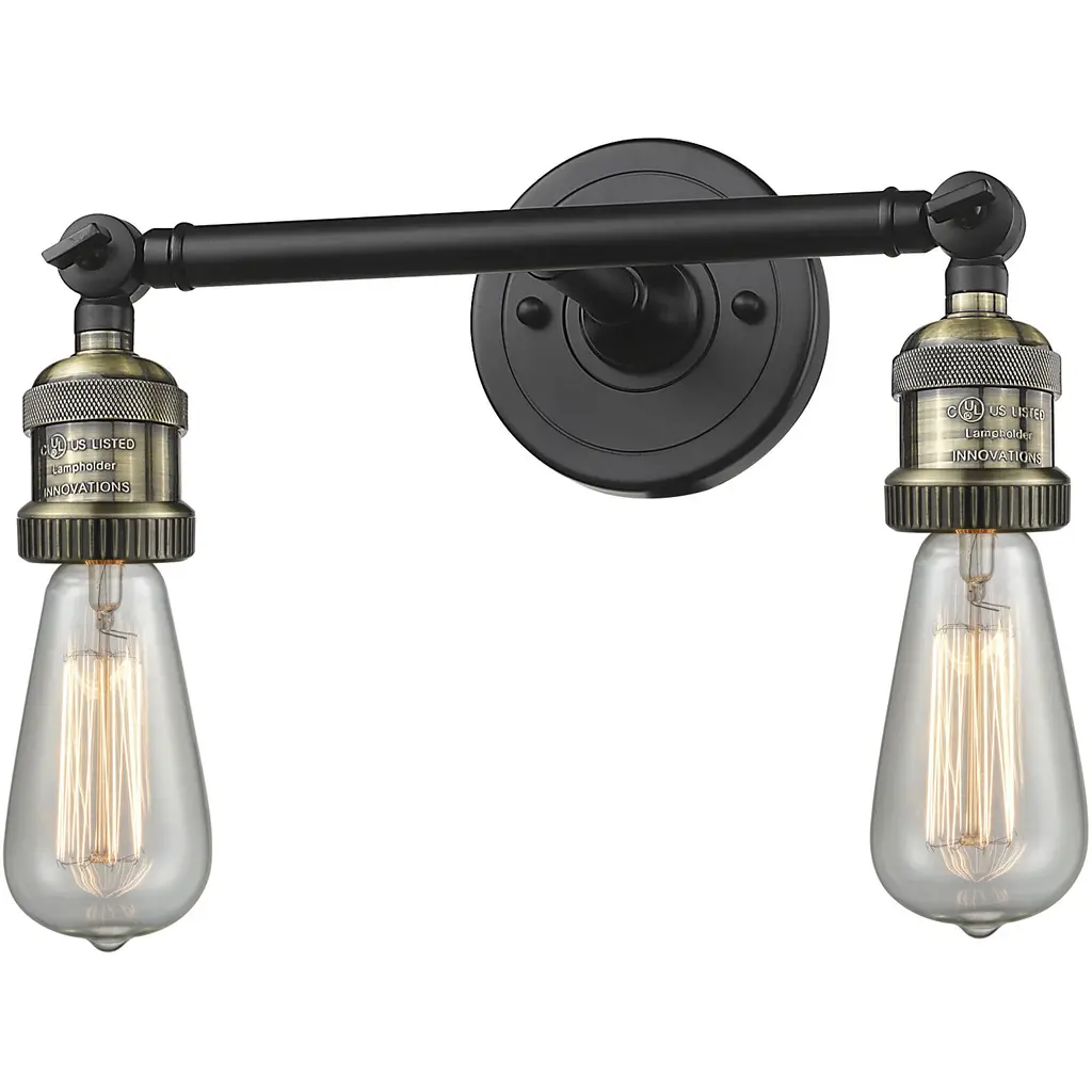 INNOVATIONS 208-AB-LED Bare Bulb 2 Light Bath Vanity Light part of the Franklin Restoration Collection Antique Brass. Style: Traditional, Industrial, Farmhouse, Restoration-Vintage. Collection Name: Franklin Restoration. Metal Finish(Body): Antique Brass. Metal Finish(Canopy/Backplate): Antique Brass. Material: Steel, Cast Brass. Dimension(in): 5(H) x 11(W) x 5(Ext). Bulb: (2)6W LED(Included). Voltage: 120. Dimmable: Yes. Color Temperature (Kelvin): 2700. Color Rendering Index (CRI): 82. Lumens: 600. Life Expectancy (Hours): 15000. Canopy Dimension(in): 4.5(Dia). Backplate Dimension(in): 4.5(Dia) x 0.75(Depth). ADA Compliant: No. California Proposition 65 Warning Required: Yes. UL/ETL Certification Type: Damp Location.