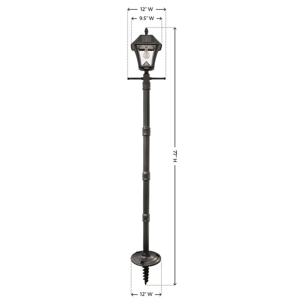 The Gama Sonic Baytown II Bulb GS-105B-SG is a single solar lamp post with EZ Anchor mounting system that features a traditional design that resembles a 19th-century lantern. Installation takes minutes and comes with all necessary hardware needed for mounting this unit anywhere where ample sunshine is available. Stylish and easy to install, this solar lamp post is the perfect energy and money saving replacement for electric or gas-powered outdoor lighting. Standing 77-inches tall, the Baytown II Bulb Solar Lamp Post is constructed of weather-resistant, rustproof rigid-resin with a black finish. This solar lamp post light incorporates our cutting-edge GS solar LED light bulb technology and provides 360-degree illumination. At dusk, the solar lamp provides a brightness of 130 lumens in a warm white (2700K) color temperature for up to 12 hours on a full charge. No wiring is needed. Just place this solar light in a spot with ample direct sunshine and let the sun do the rest.