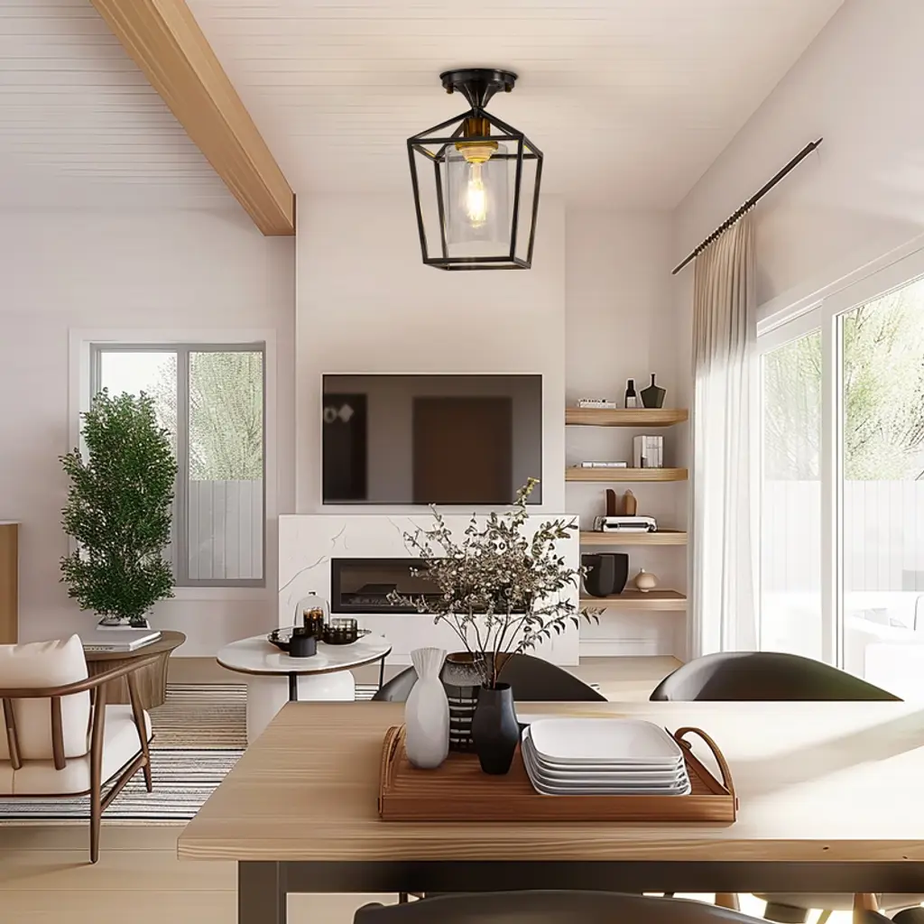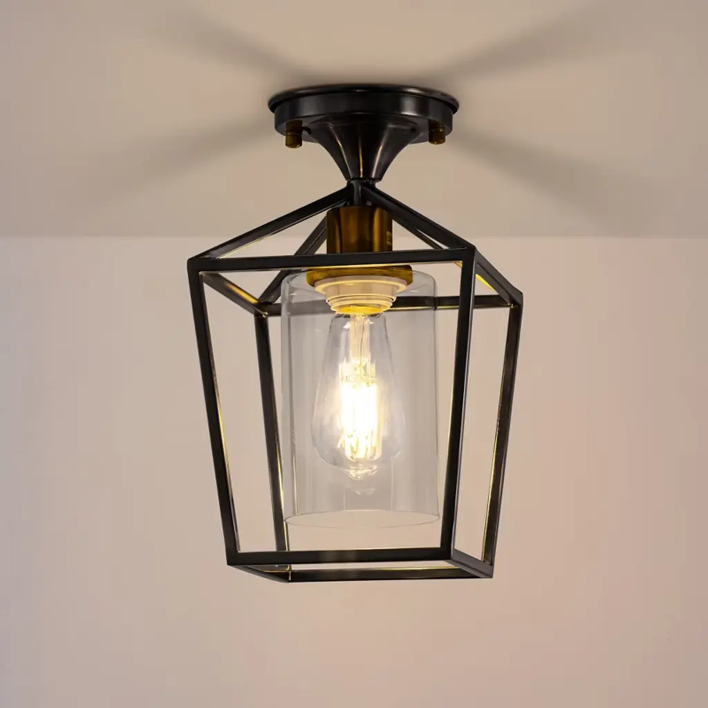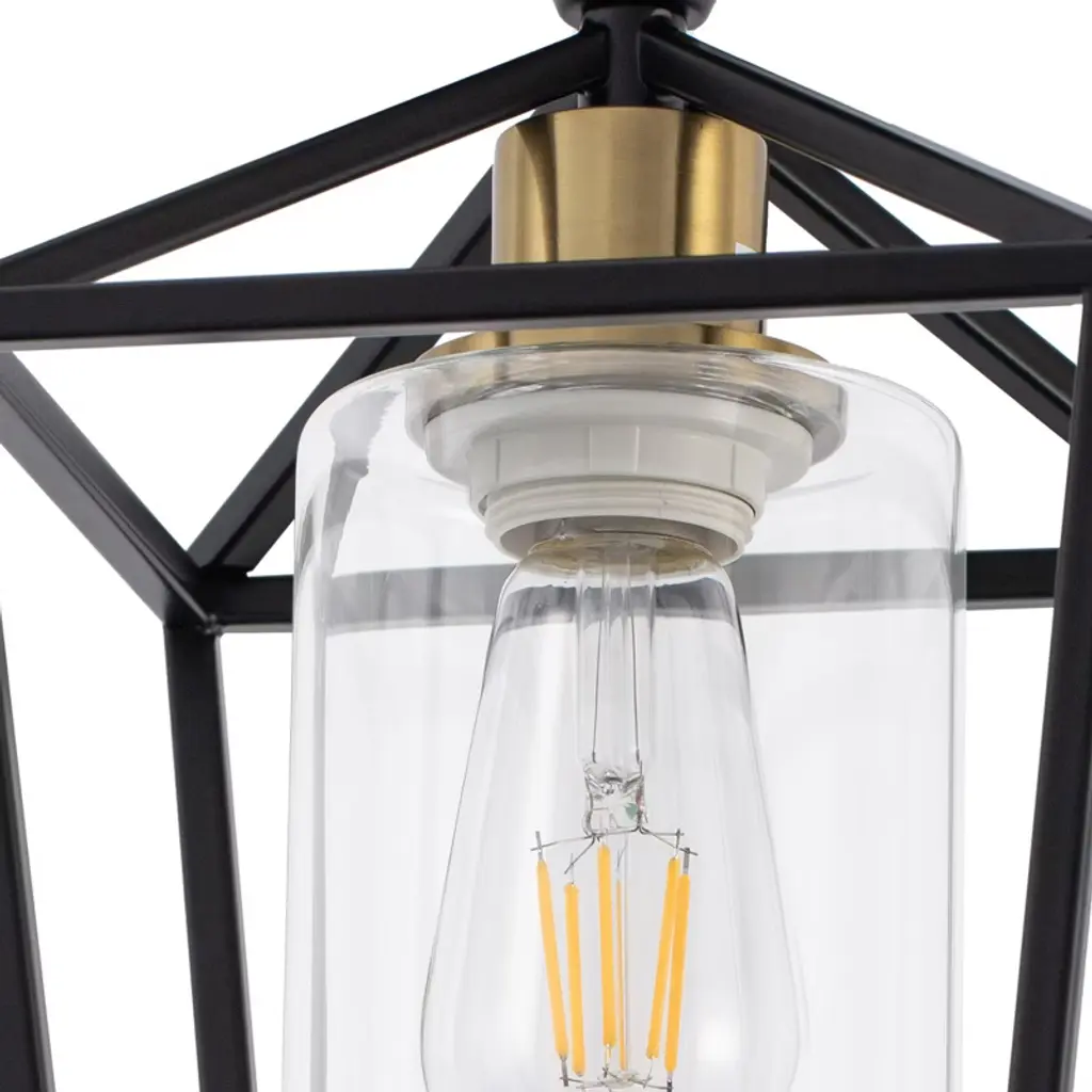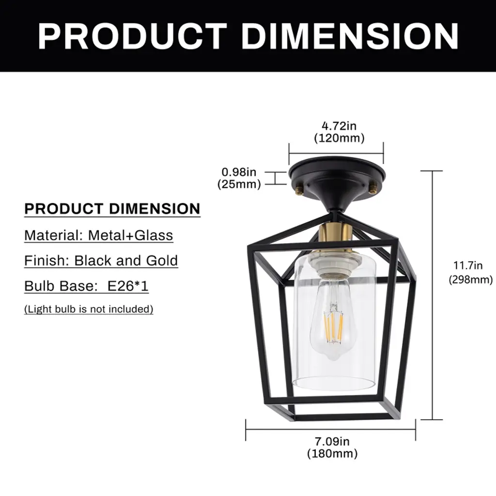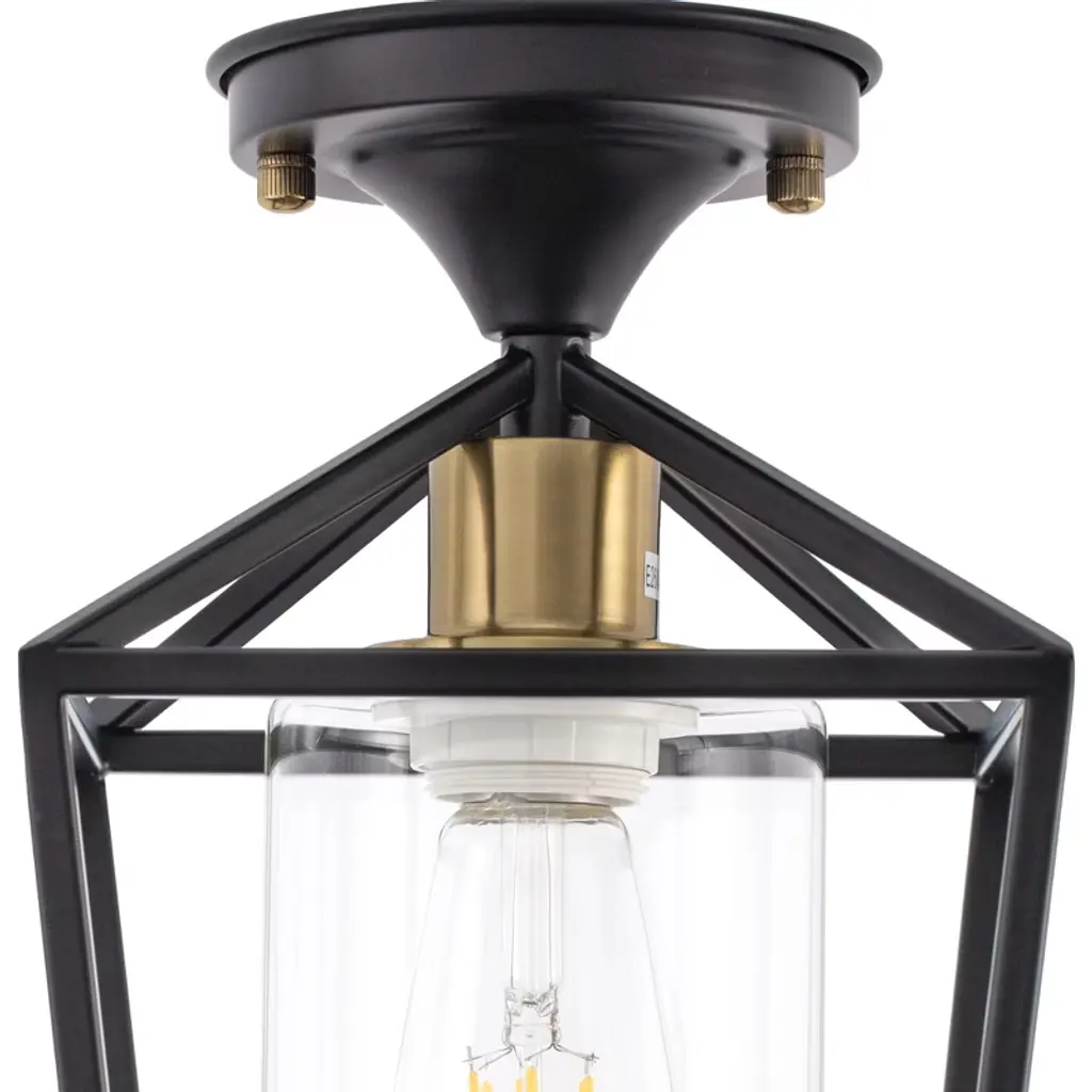 Enhance your home with the 7 in. 1-Light Black Gold Semi Flush Mount Ceiling Light, combining farmhouse charm and modern style. The retro cage design, sleek black finish, and clear glass shade bring rustic elegance to any room. Perfect for kitchens, hallways, and entryways, this fixture provides a warm and welcoming glow, elevating the ambiance throughout your home.