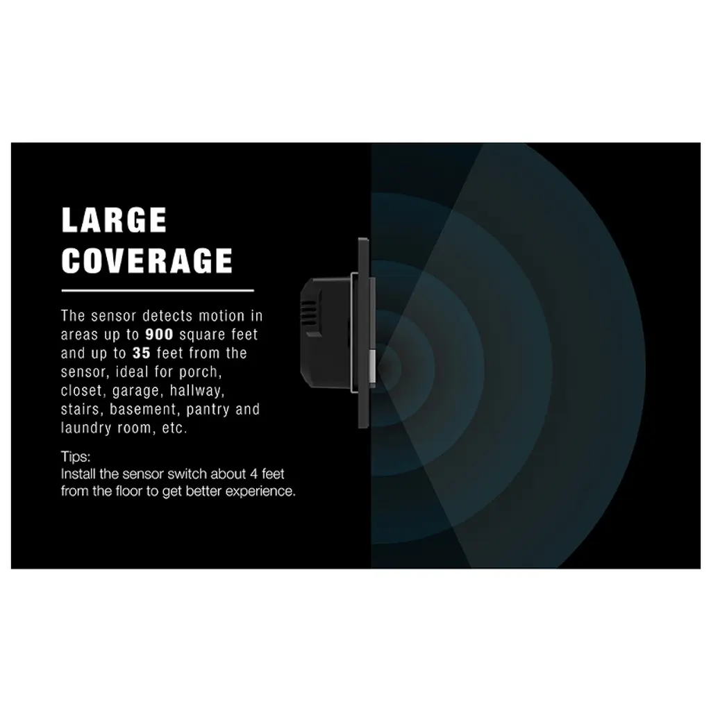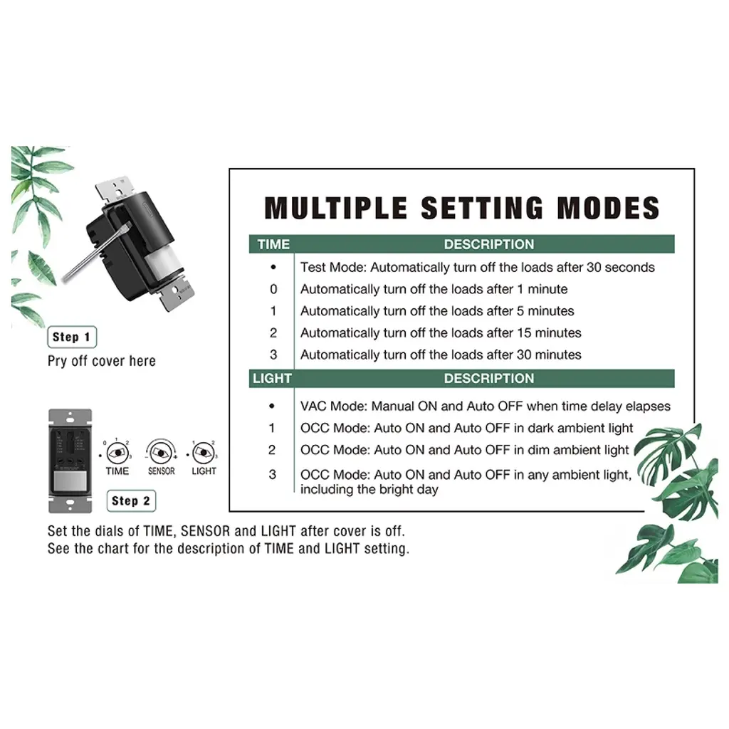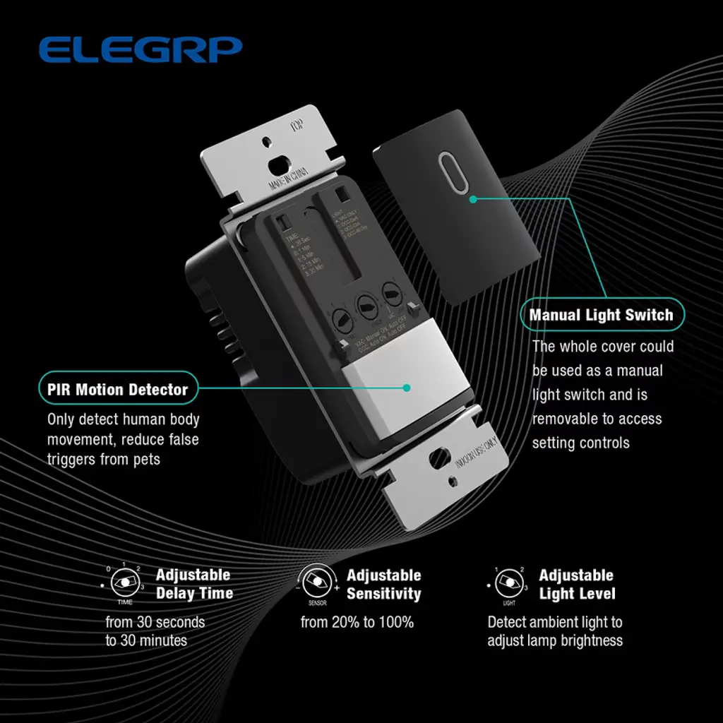 ELEGRP Motion Sensor Switch automatically turns lights and motors on and off according to the motion detected in the room. The sensor detects motion in areas up to 900 square feet and up to 35 feet from the sensor, ideal for porch, closet, garage, hallway, stairs, basement, pantry and laundry room, etc. It combines occupancy and vacancy sensors into one motion sensor wall switch for energy efficiency. In occupancy mode lights are automatically turned on when you enter a room and automatically turned off after the room is vacant. This is especially convenient when entering a room with your hands full, such as an entryway, laundry room, garage, etc. Vacancy mode is another option to choose from, which requires manually turning the light on and automatically turns the light off when the room is vacant. Variable time delay from 30 seconds to 30 minutes allows users to choose their preferred option. Multiple setting modes meet for different usage scenarios at home.