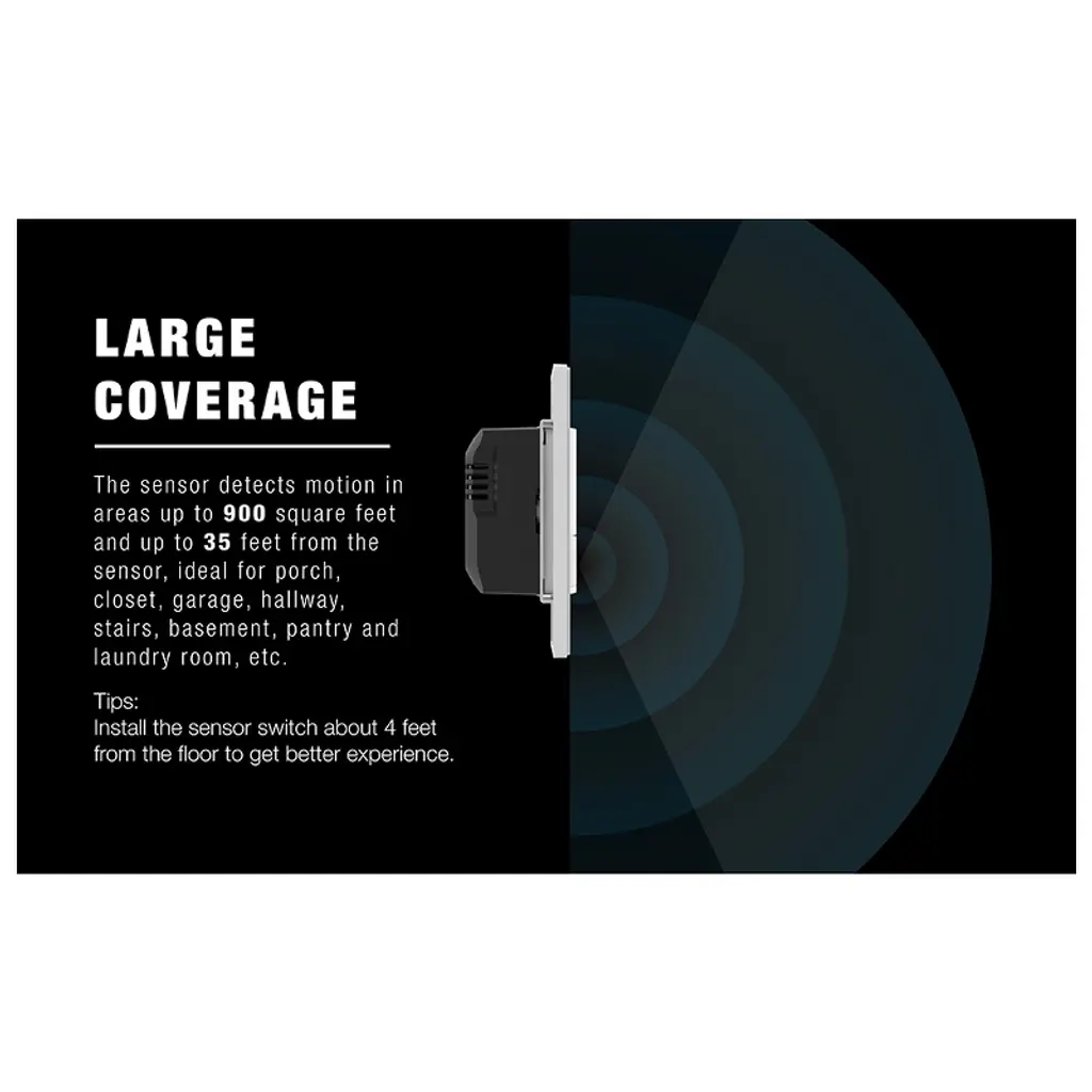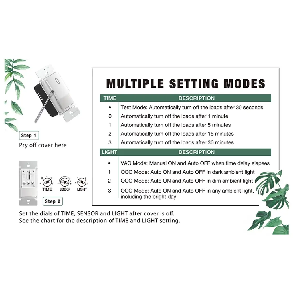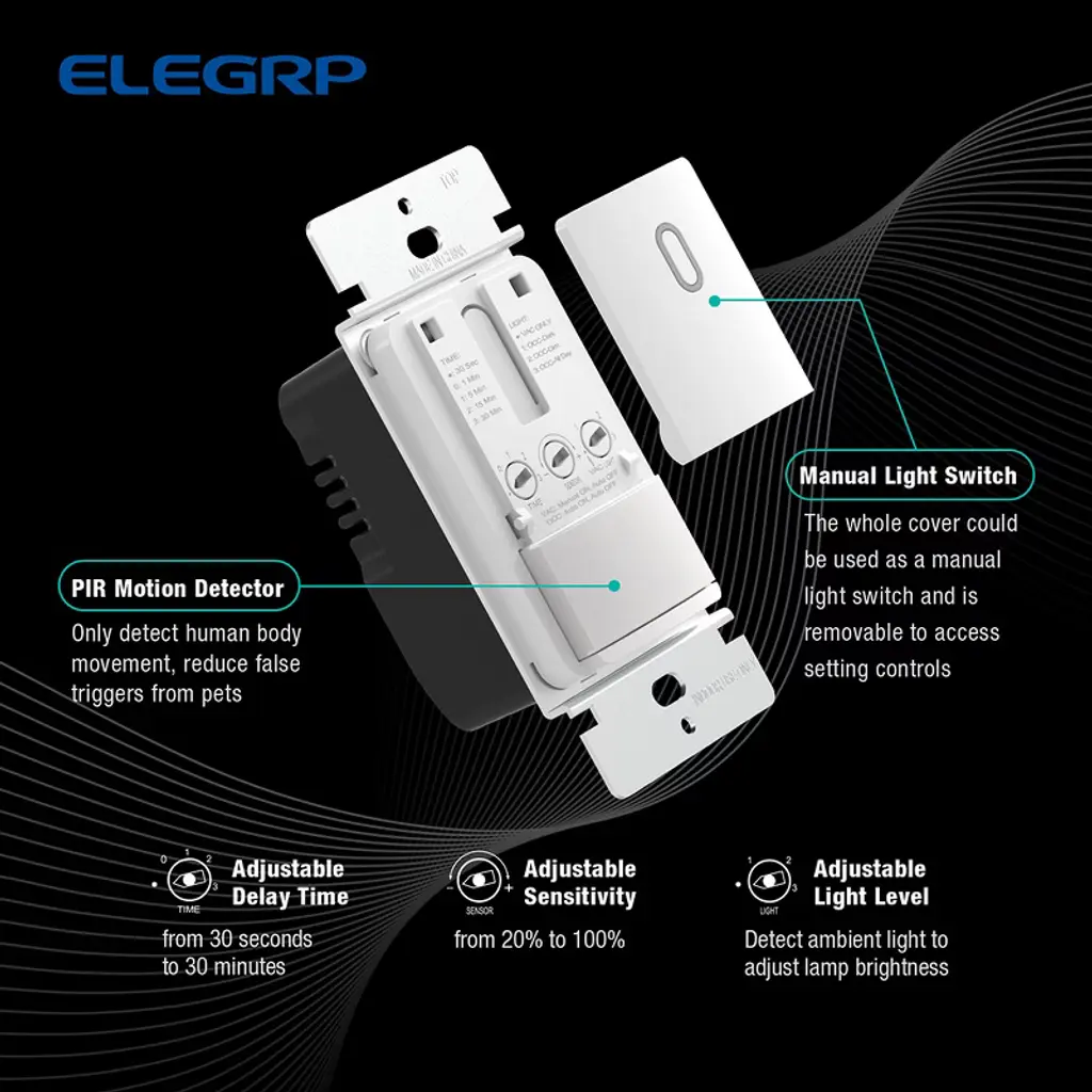 ELEGRP Motion Sensor Switch automatically turns lights and motors on and off according to the motion detected in the room. The sensor detects motion in areas up to 900 square feet and up to 35 feet from the sensor, ideal for porch, closet, garage, hallway, stairs, basement, pantry and laundry room, etc. It combines occupancy and vacancy sensors into one motion sensor wall switch for energy efficiency. In occupancy mode lights are automatically turned on when you enter a room and automatically turned off after the room is vacant. This is especially convenient when entering a room with your hands full, such as an entryway, laundry room, garage, etc. Vacancy mode is another option to choose from, which requires manually turning the light on and automatically turns the light off when the room is vacant. Variable time delay from 30 seconds to 30 minutes allows users to choose their preferred option. Multiple setting modes meet for different usage scenarios at home.