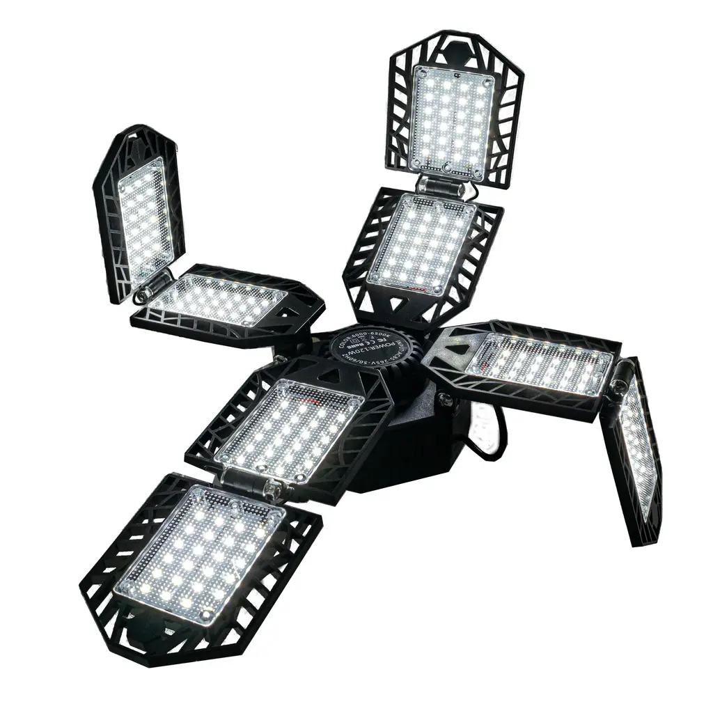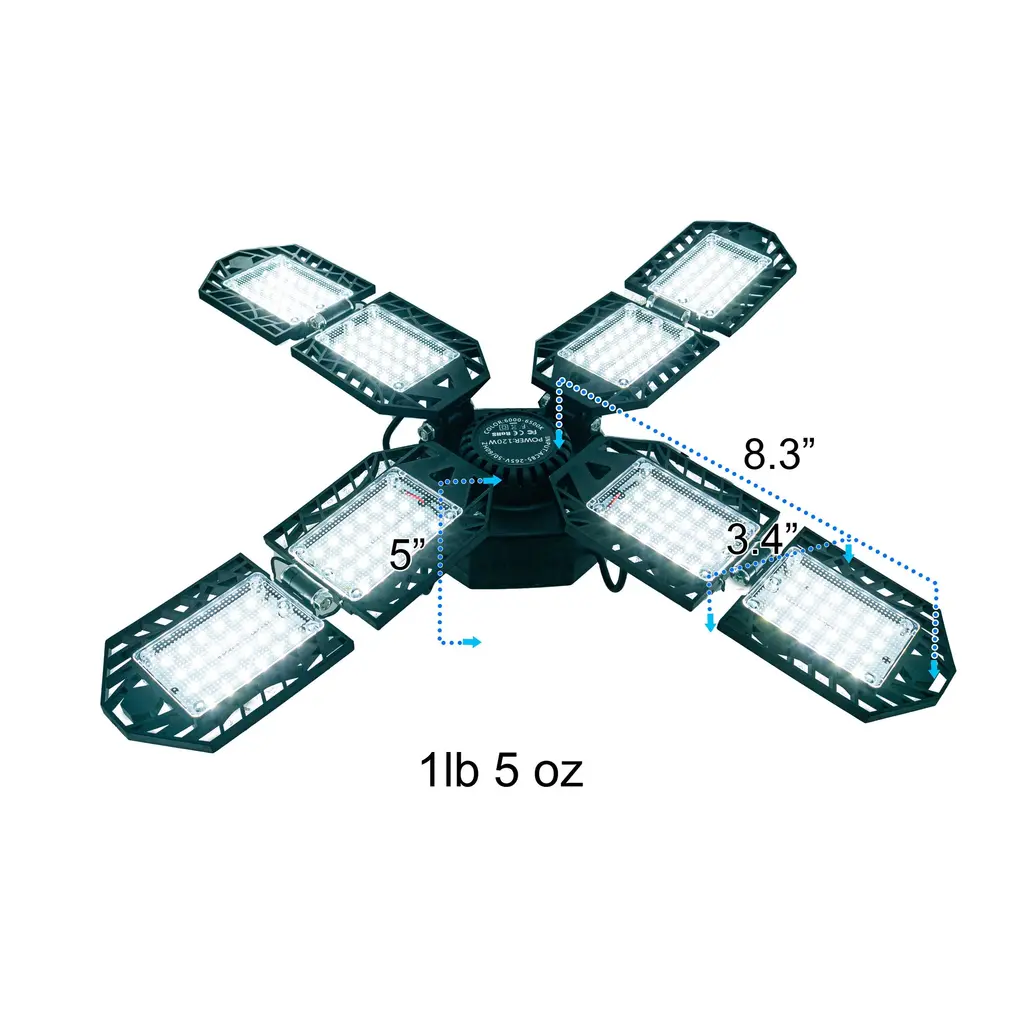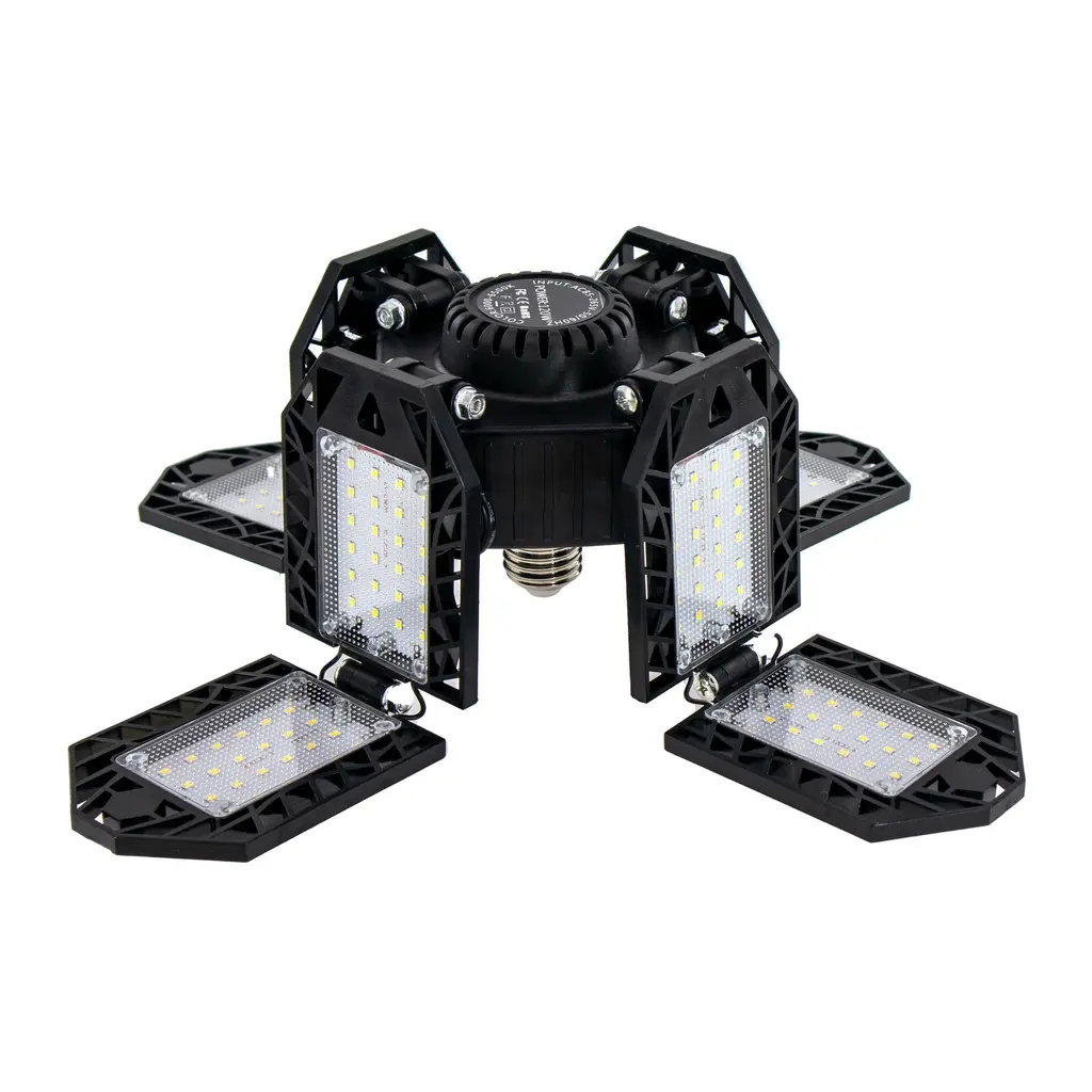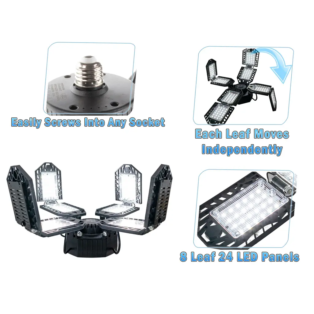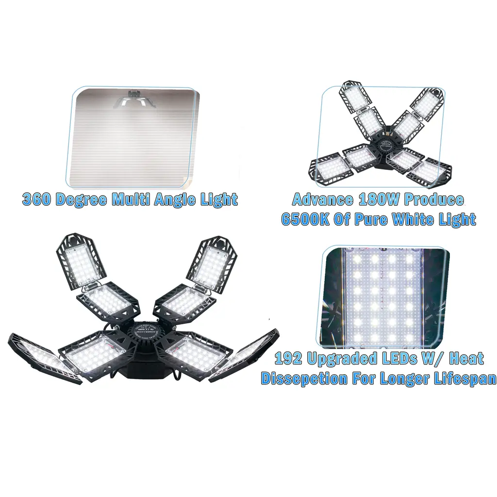 Ultra Bright LED Garage Light with 8 Adjustable Aluminum Heads The 8-Leaf LED Garage Light is a newly upgraded high-quality lighting solution designed to bring brightness and efficiency to your garage, basement, workshop, or warehouse. With 8 ultra-bright adjustable aluminum LED heads, it features 10000 lumens of pure white light at 6500K and 360-degree coverage if desired. This 180 watt bulb is 8 times brighter than a standard 180w bulb. The aluminum construction and advanced heat dissipation technology prolong the lifespan of the lights, making it a durable and long-lasting investment.Independent Adjustable Wide Angle Design This LED light features an independent adjustable wide-angle design, allowing you to cover the desired area perfectly with its unique deformable 8 wide-angle pedals. Each light wing swings 90 degrees, making it easier for you to direct the light exactly where you need it. This LED garage light provides the best indoor lighting experience and is perfect for any area lighting such as work areas, closets, garages, barns, utility rooms, warehouses, shops, basements, and more.Easy Installation As Simple As Screwing In A Light Bulb The LED garage light is energy-efficient and easy to install, consuming only 180W while producing a high color rendering index of 80+ and daylight brightness of 10000 lumens. Installation is as simple as replacing your previous light bulb with this LED light, which can be screwed into a standard E26/E27 socket. This LED light is the closest to sunlight inside your home and can significantly reduce your energy costs.