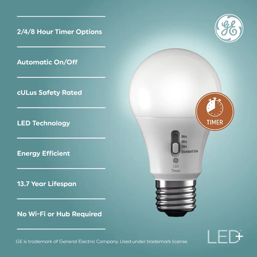 Introducing our innovative automatic GE LED+ Timer LED Light Bulb - the perfect solution to effortlessly managing your lighting and security needs. Whether you're at home, work, or away on vacation, rest assured that your light is under control enhancing security and energy efficiency. With the built-in automatic timer function you can easily program your lights to turn on and off at a preset time. Simply choose the amount of time on the bulb that you want the light to stay on for: 2,4, or 8 hours then screw the bulb into the lamp or light fixture that fits an E26 medium-size base light bulb. Turn the light switch to the ON position at the exact time you want the light to turn on each day. You can also use the automated on/off light bulb as a general-purpose light bulb by choosing standard use on the bulb providing you a soft white light when you need it. To reset, simply turn the light switch off and turn back on when you prefer the light to be on each day adjusting the time limits if needed. With its long-lasting LED technology, this bulb consumes significantly less energy than a traditional incandescent bulb, helping you reduce your electricity bills and minimize your carbon footprint. Plus, its robust construction ensures reliable operation and a lifespan of up to 13 years providing long-term value and peace of mind. So easy to use, there's no app, hub or Wi-Fi needed!