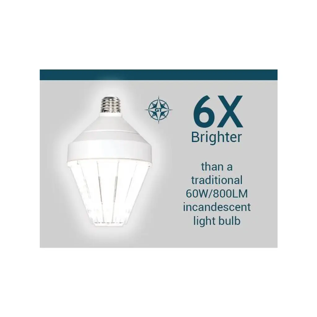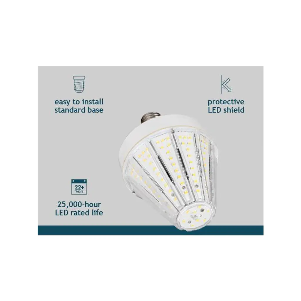 This energy-efficient LED bulb saves 83% of energy by replacing a 300-watt incandescent bulb with just 40 watts. It delivers even, omnidirectional light coverage, making it ideal for a variety of spaces. With an impressive lifespan of up to 22.5 years (based on 3 hours of use per day), this bulb is 6 times brighter than a standard incandescent bulb. The 5000K daylight white light offers glare-free and flicker-free illumination, promoting eye health and comfort. Designed to fit standard E26 medium base sockets, it features a new LED chip cover that protects against dust, moisture, and bugs. Suitable for use in open sockets and damp locations, it’s perfect for installation in garages, warehouses, barns, or shops, providing reliable, bright lighting wherever you need it.