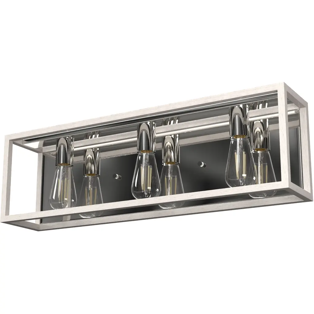 Material: Metal, Finish Color: Distressed White, Width: 25", Height: 7.5", Depth: 5", Backplate Width: 25", Backplate Length: 7.5", Lamping Type: Incandescent, Number Of Bulbs: 3, Wattage: 60 Watts, Dimmable: Yes, Moisture Rating: Damp Rated
