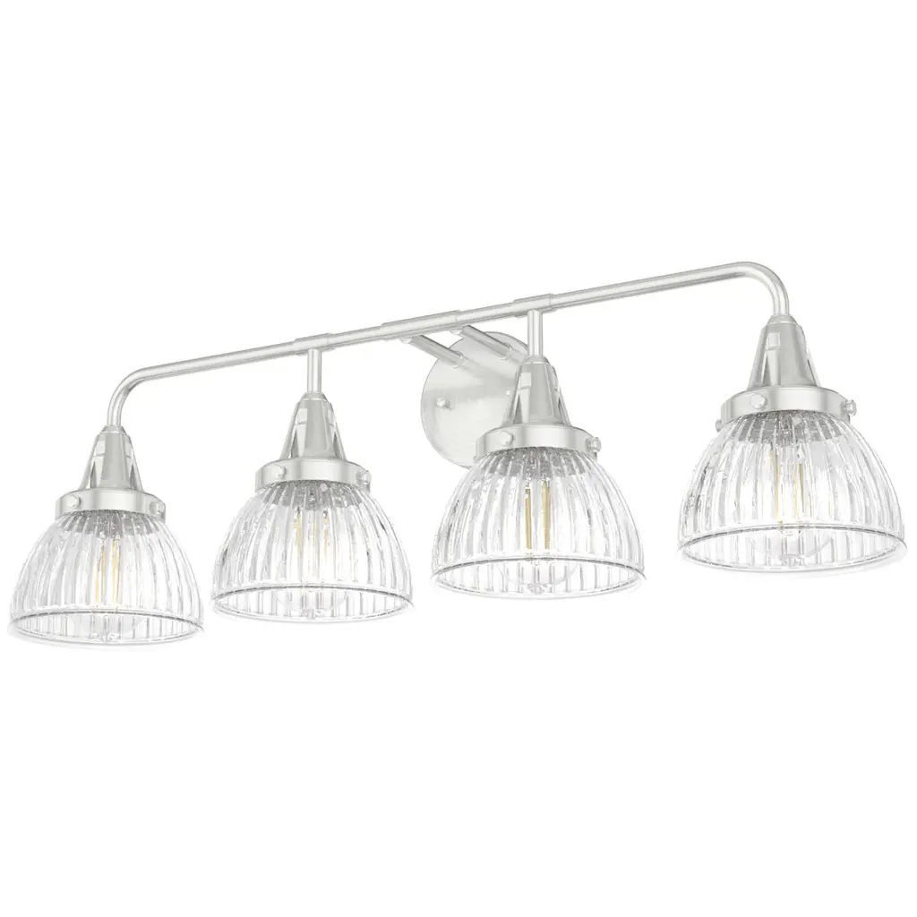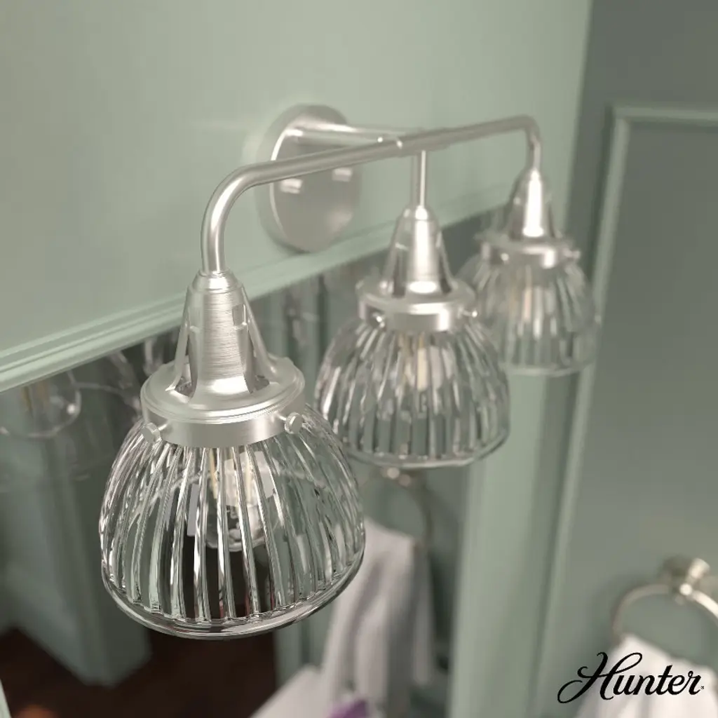 An antique look with industrial details. The Cypress Grove 3 light vanity is an elegant twist on modern industrial lighting. This modern vanity light boasts fluted glass detailing and an indoor damp rating, making it a wonderful addition to spaces exposed to moisture, like bathrooms. Carry this industrial theme throughout your space by pairing this vanity light with other Cypress Grove fixtures. Rated for indoor spaces exposed to humidity Requires 3 E26 bulbs. Bulbs not included. INDOOR-DAMP RATED: For use in indoor spaces exposed to humidity like bathrooms and laundry rooms. WARRANTY: One-year limited warranty backed by the trusted experts at Hunter. Assembly Required: Yes / Mounting Direction: Down / Dimmable: Yes / Shade Included: Yes. ,