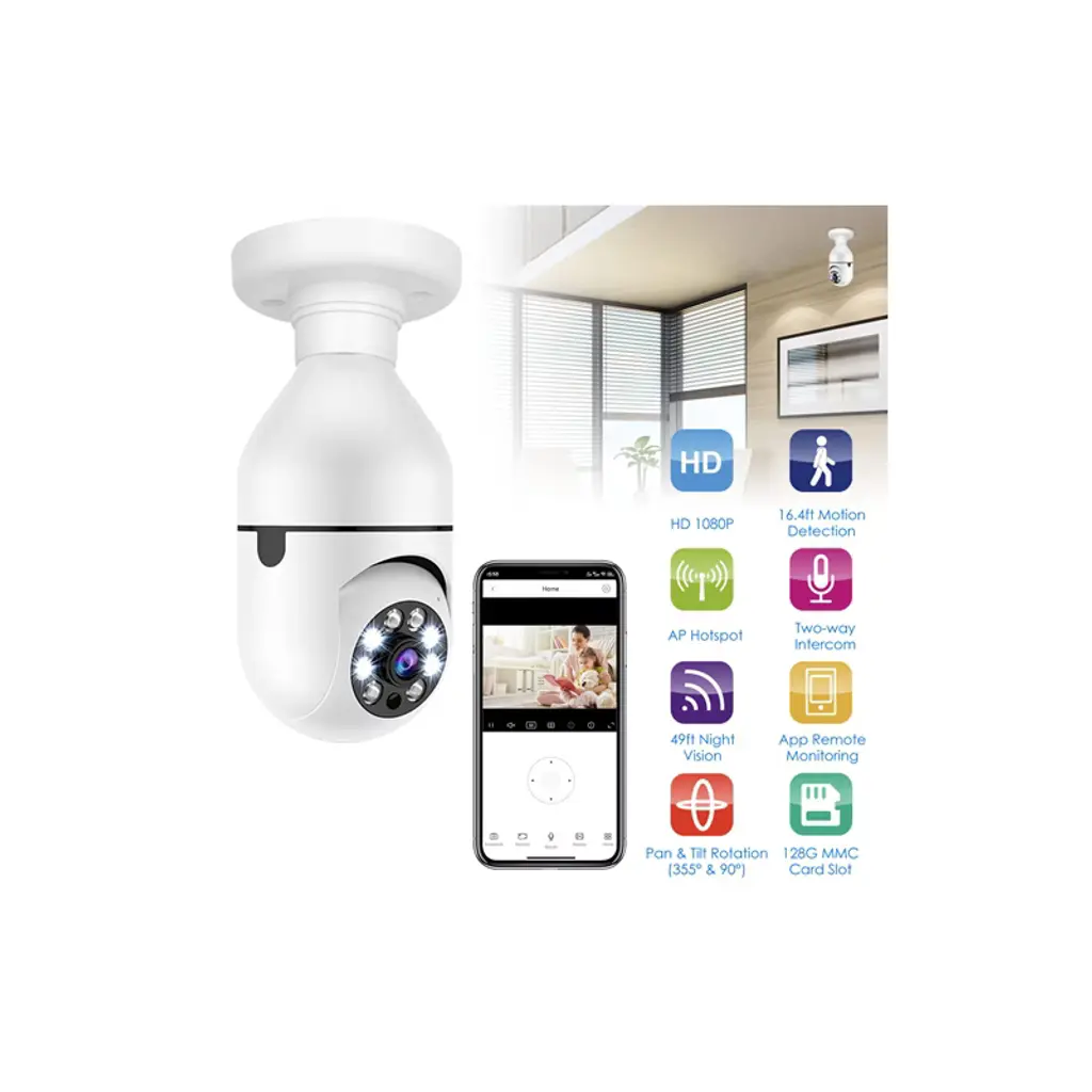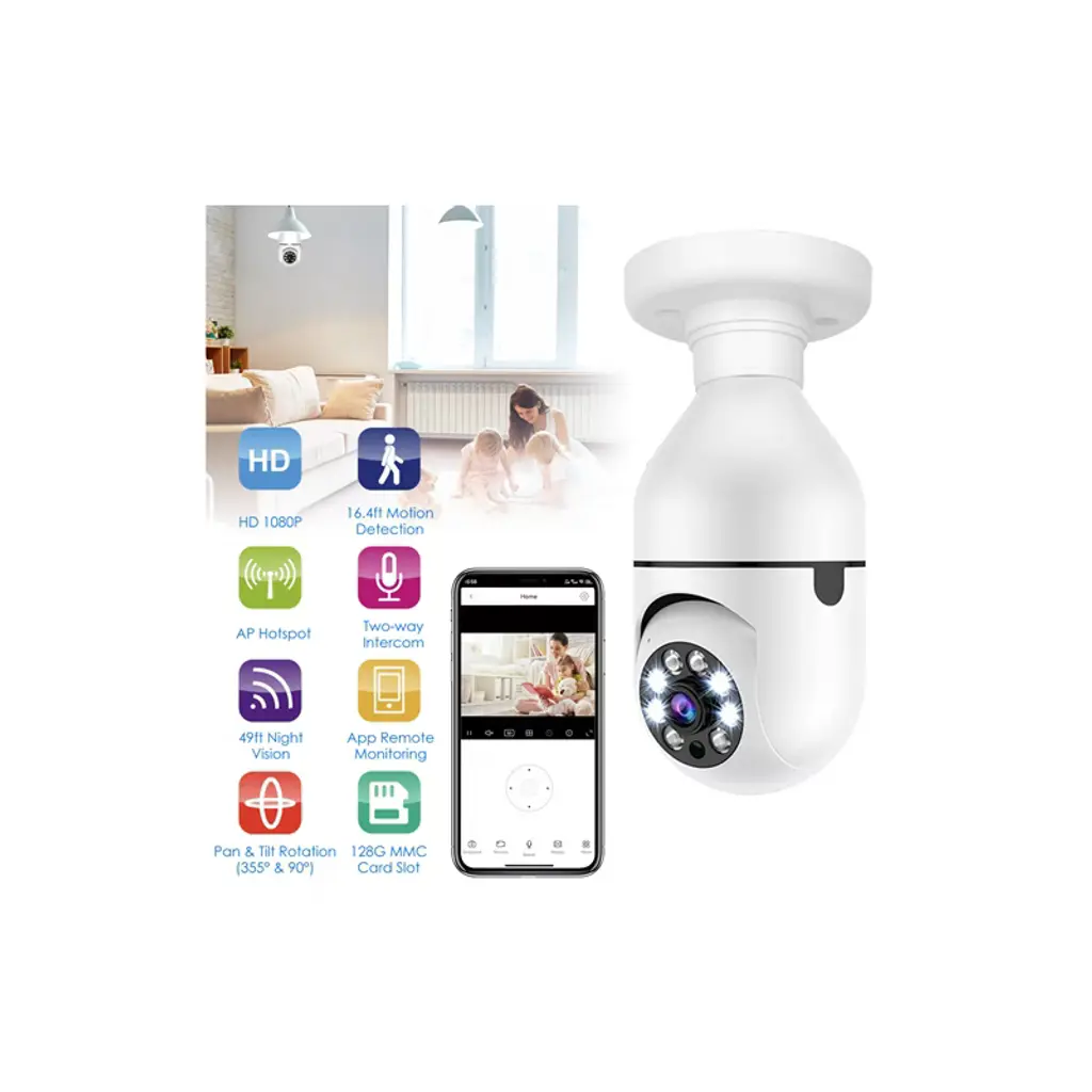 Enhance your home security with the E27 WiFi Bulb Camera, a cutting-edge surveillance device that combines a high-definition camera with the convenience of a light bulb. Designed for effortless installation and comprehensive monitoring, this camera is perfect for both home and office use. Key Features: High-Definition Clarity: Equipped with a 1080P HD camera, this device captures crystal-clear video with vibrant colors and sharp details, ensuring you never miss a moment. Smart Night Vision: The built-in infrared night vision allows for effective surveillance in low-light conditions, automatically switching to color during nighttime motion detection. Easy Installation: Simply screw the camera into any standard E27 light socket (110-220V). With the YCC365 Plus app, you can connect in minutes, making setup a breeze. Comprehensive Monitoring: The camera offers 360° coverage, with a pan-tilt feature that allows horizontal movement of 355° and vertical adjustment of 90°, ensuring no blind spots. Real-Time Alerts: The motion detection feature sends instant notifications to your device when movement is detected, providing peace of mind and immediate awareness. Two-Way Audio Communication: Communicate effortlessly with family members or pets using the integrated two-way intercom, allowing you to listen and speak through the app. Robust Storage Options: Supports MMC cards up to 128GB (not included) for storing recorded footage, ensuring you have access to past events when needed. Specifications: Brand: iMounTEK Socket Type: E27 Resolution: 1080P Full HD Night Vision Distance: Up to 15m (49ft) Camera Range: Up to 30m (98ft) Dimensions: 6.5 x 6.5 x 18 cm (2.56 x 2.56 x 7.09 in) Weight: 202 g (0.45 lbs) Package Includes: WiFi Bulb Camera, E27 socket base, screws, user manual