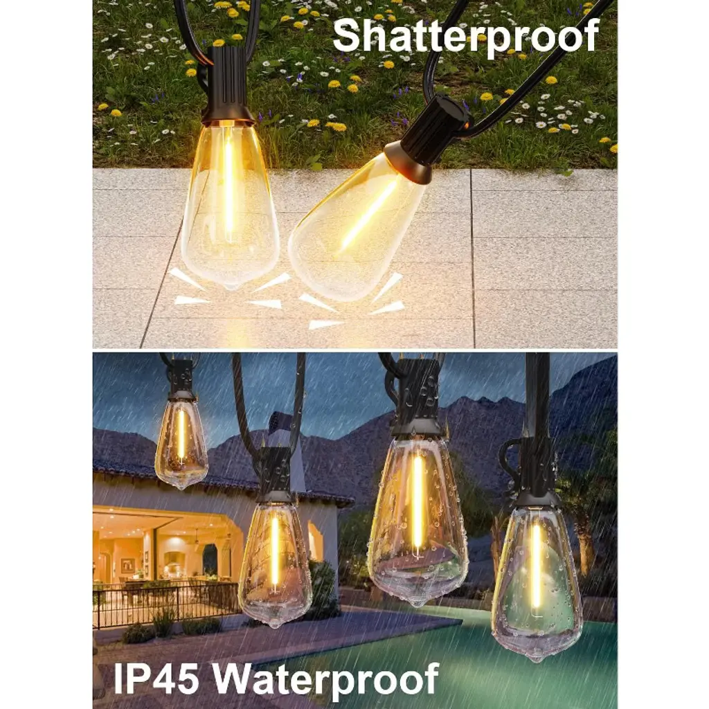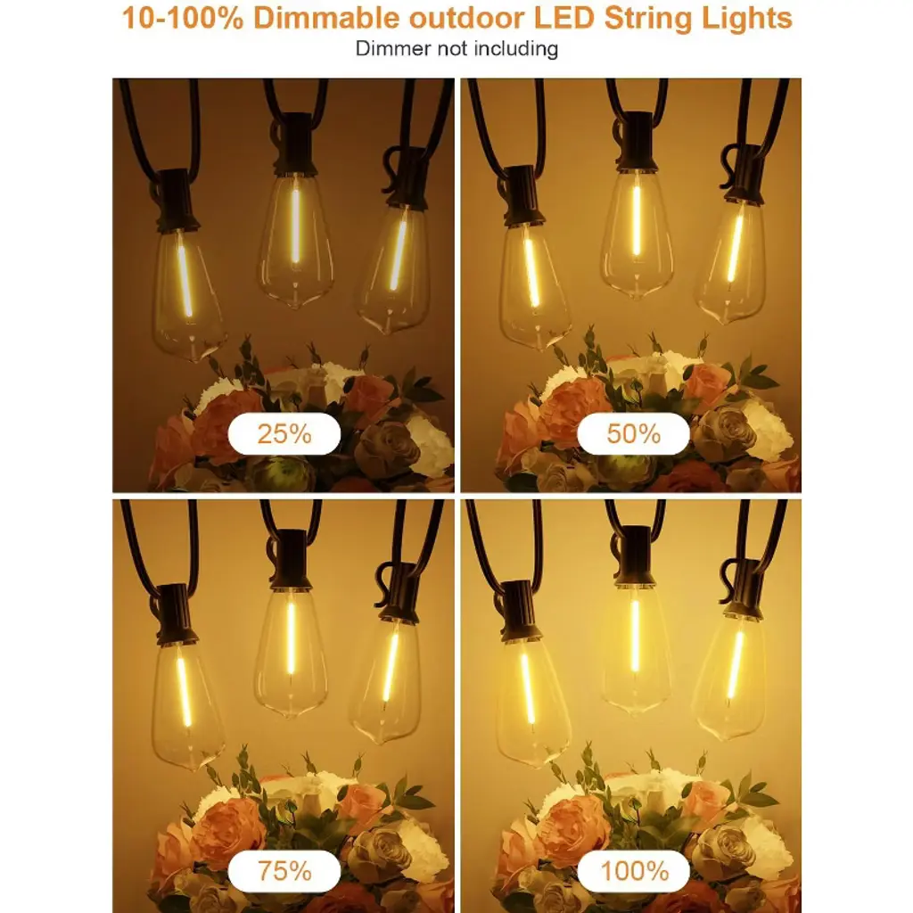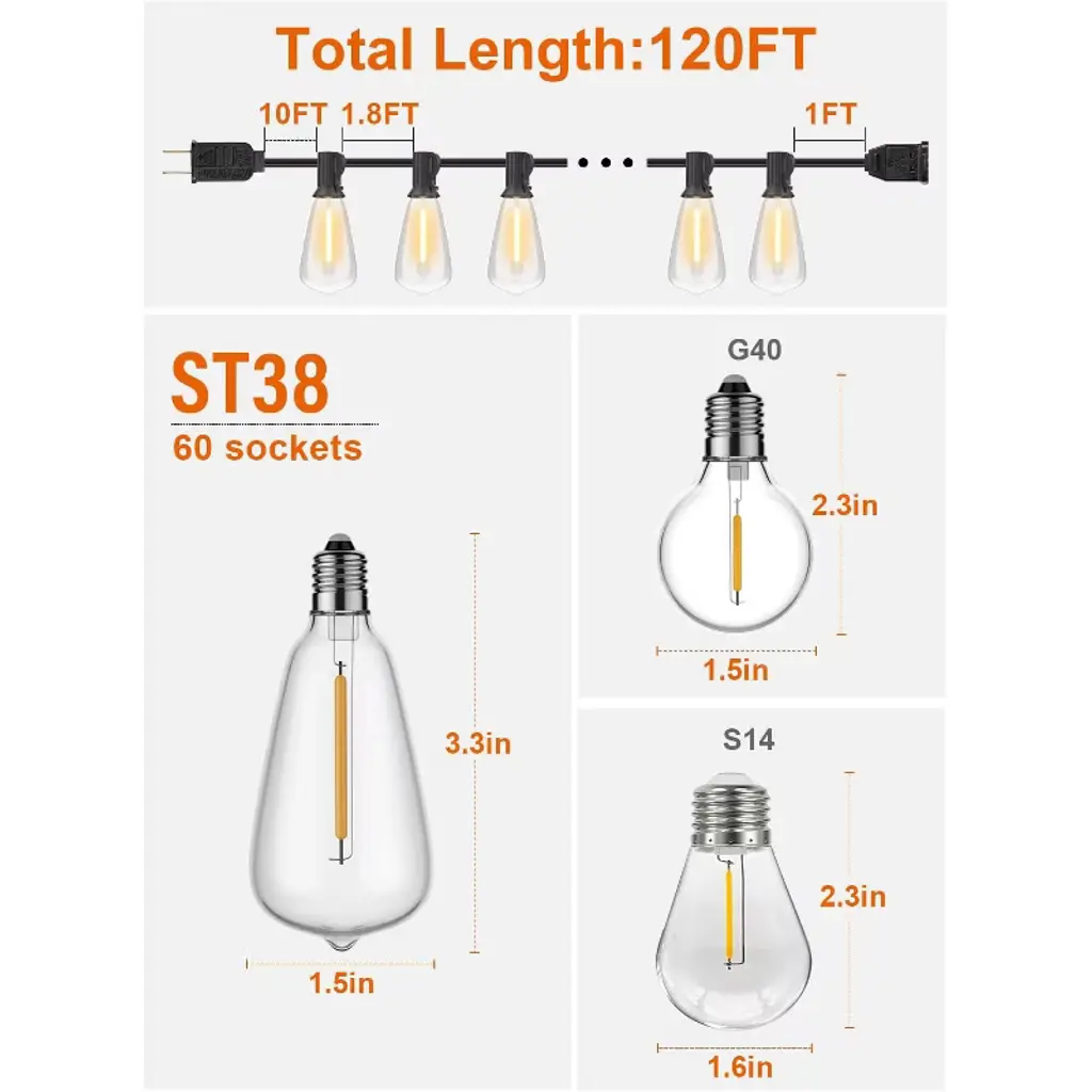 Enhance your outdoor space with these outdoor string lights! Featuring 64 shatterproof ST38 LED bulbs on a 120 - foot line, they offer wide - range illumination. These energy - efficient bulbs use less electricity than traditional ones, stay cool when on, and have an impressive lifespan of up to 30,000 hours. With a 2700K color temperature, they create a cozy and inviting atmosphere. They're all - weather resistant, so you don't need to worry about changing weather. You can adjust the brightness from 5 - 100%, making them suitable for romantic parties or family gatherings. Compatible with most dimmer switches (dimmer not included), they're easy to use. Ideal for backyards, gazebos, porches, and gardens, these lights will transform your outdoor area into a warm and inviting space.