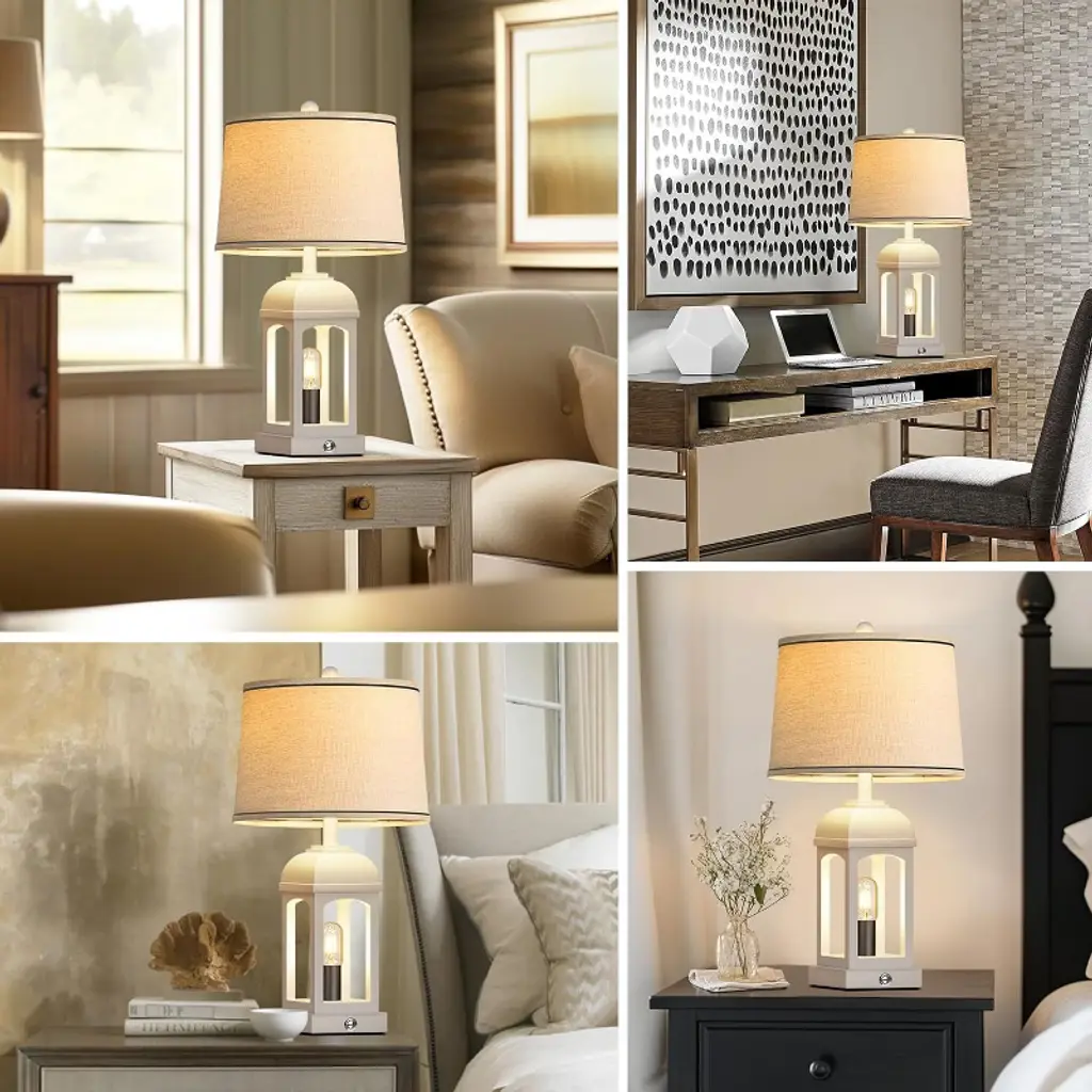 Ktmbdw Set Of 2 Farmhouse Lamps, Rustic Vintage Bedroom Table Lamp With 2 Usb Charging Ports For End Table Entryway, 4 Bulbs Included, White
