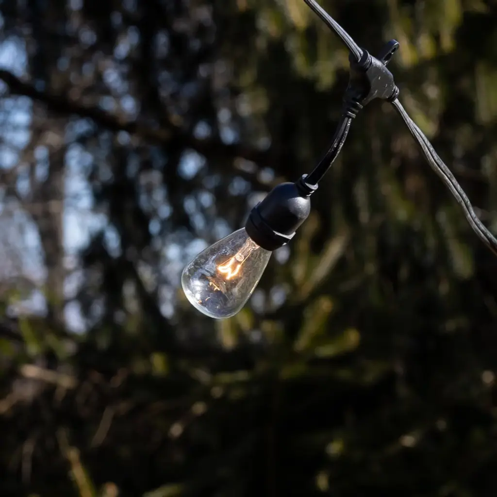 Commercial-grade electric string lights with Edison style bulbs create a trendy and vintage atmosphere to your indoor or outdoor décor. Their glowing illumination adds perfect accent lighting to a patio, deck, porch, or party tent. String lights are perfect for making a party, celebration, or everyday outdoor living area more festive.