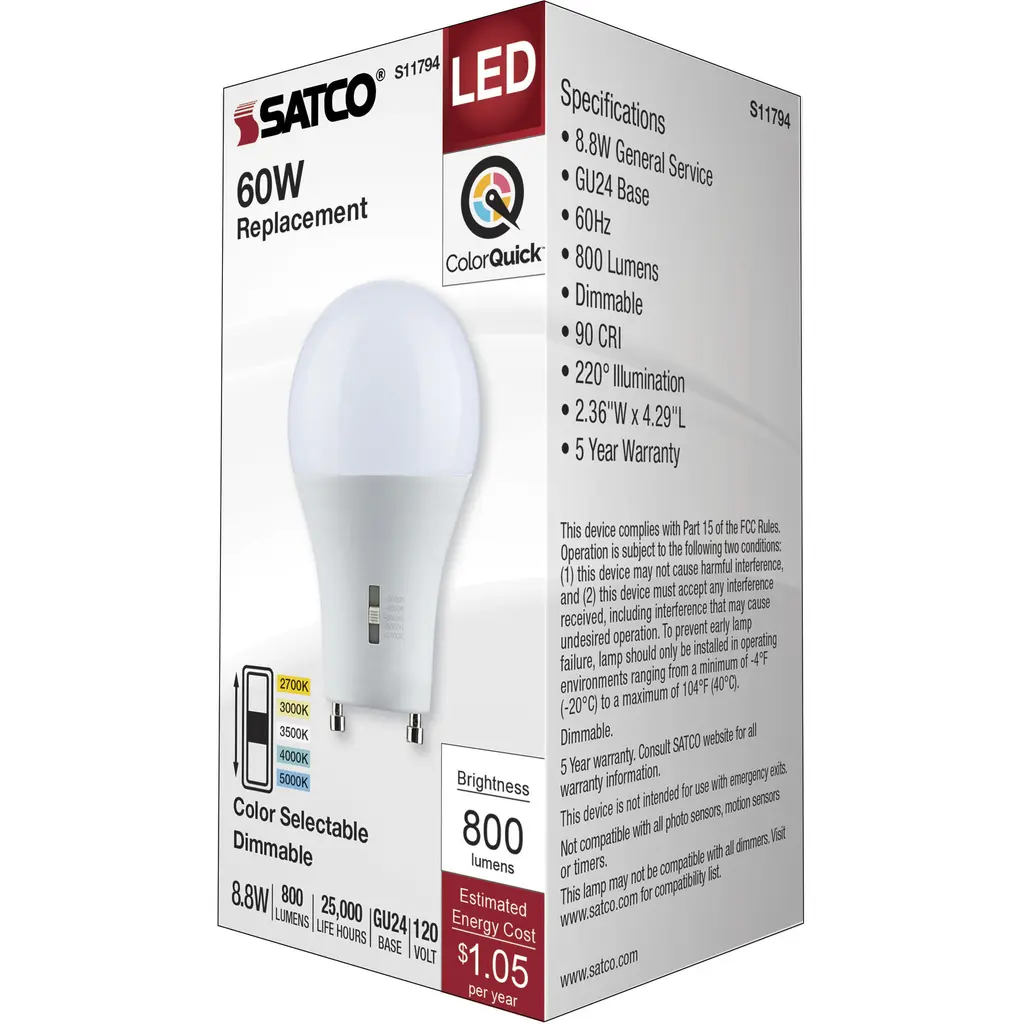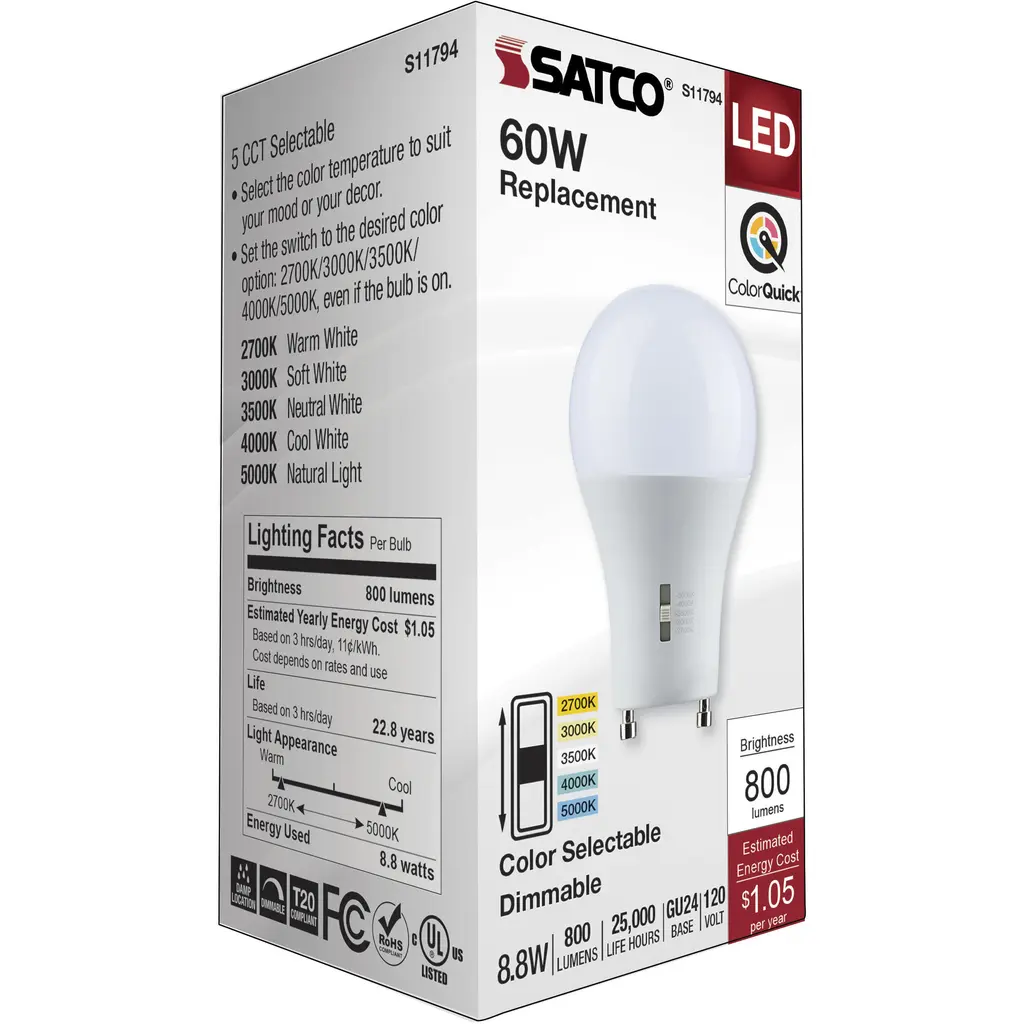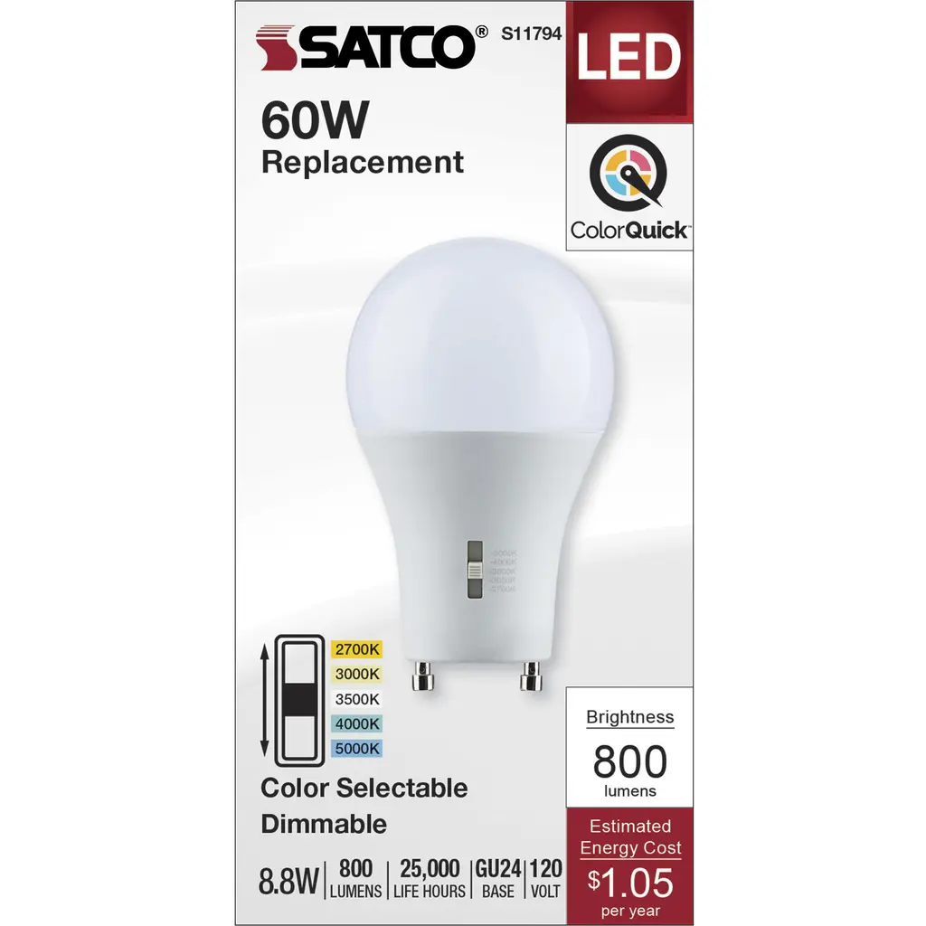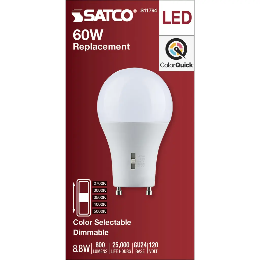 8.8 Watt A19 LED - Bi Pin GU24 Base - CCT Selectable - 120 Volt - White Finish
