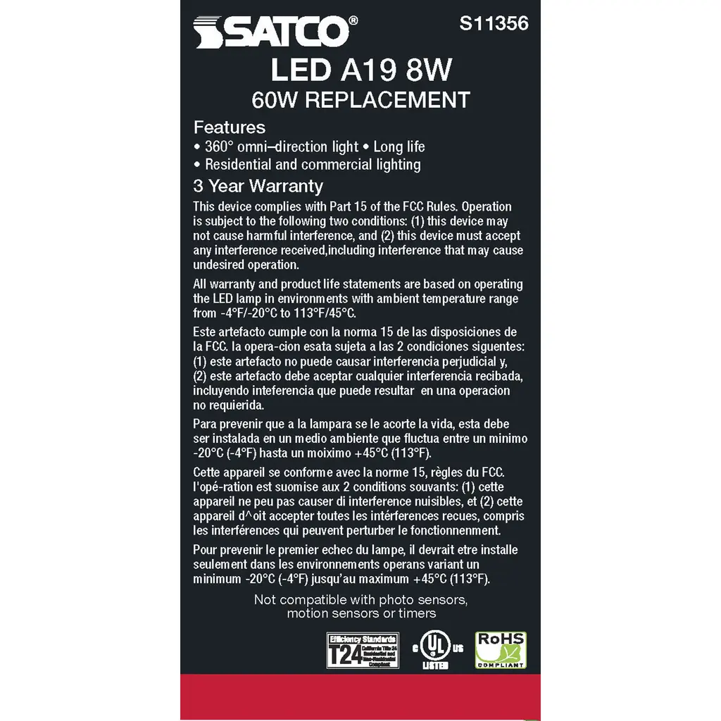 8 Watt A19 LED Lamp - Soft White 2700K Medium Base 120 Volts