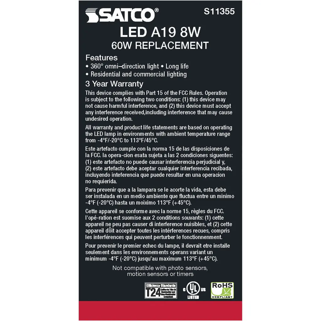 8 Watt A19 LED Lamp - Clear 3000K Medium Base 120 Volts