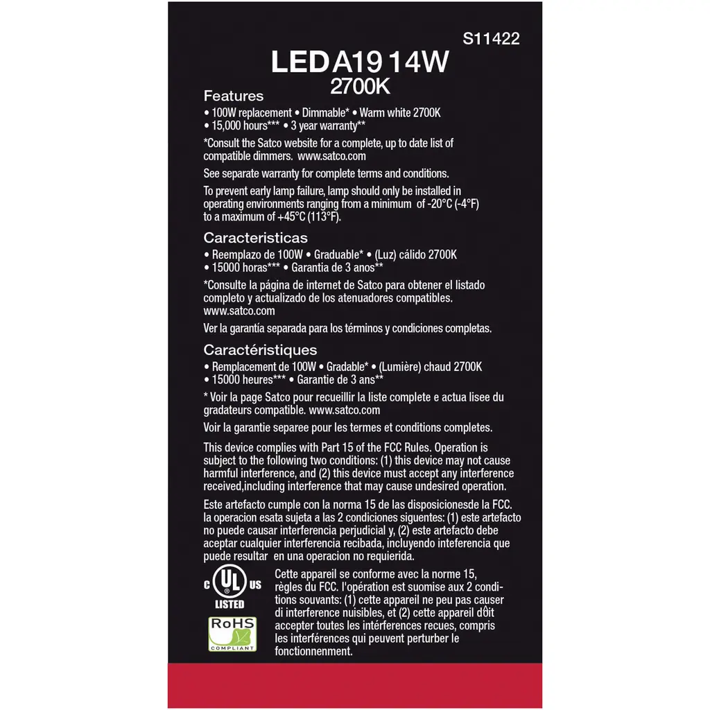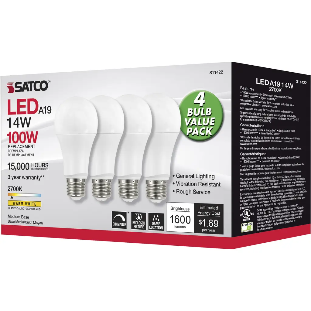 15.5 Watt A19 LED - 2700K - Dimmable - Medium Base - 230 Degree Beam Angle - 4-Pack