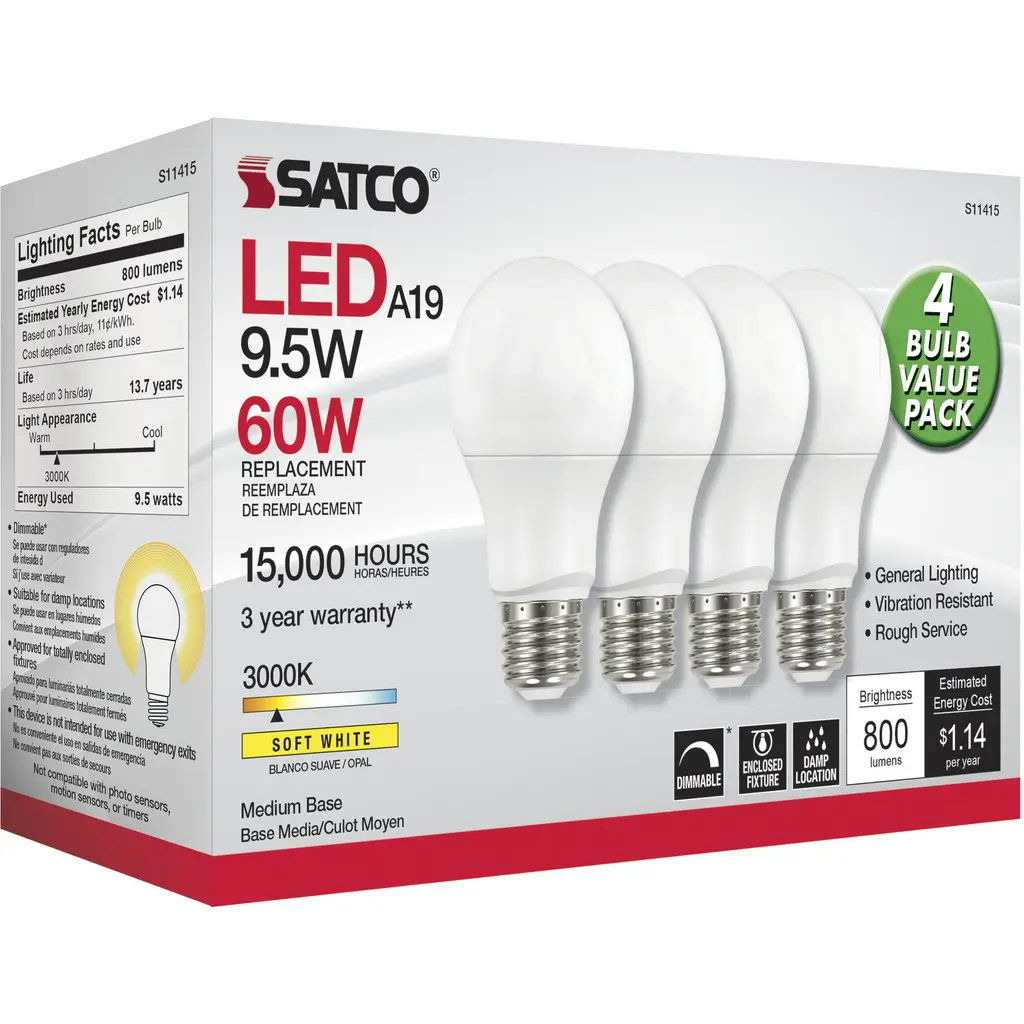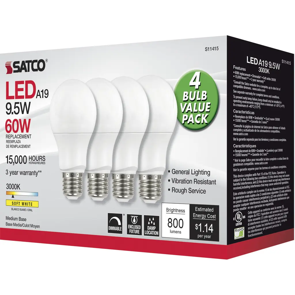 9.5 Watt A19 LED - 3000K - Dimmable - Medium Base - 230 Degree Beam Angle - 4-Pack
