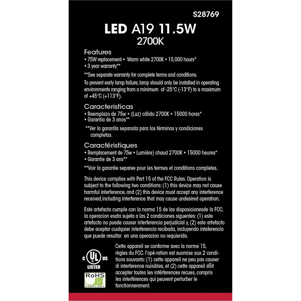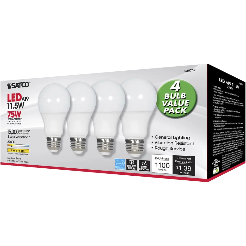 11.5W; A19 LED; 2700K; Medium base; 220 deg. beam spread;120V; 4-pack