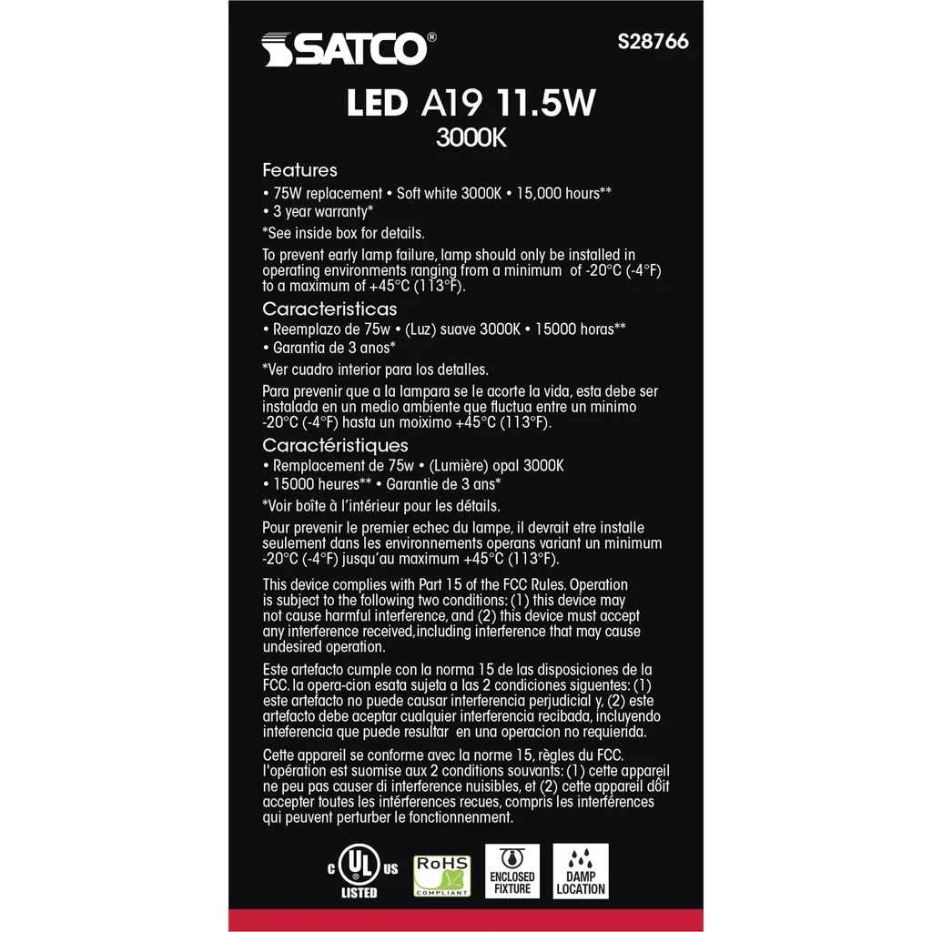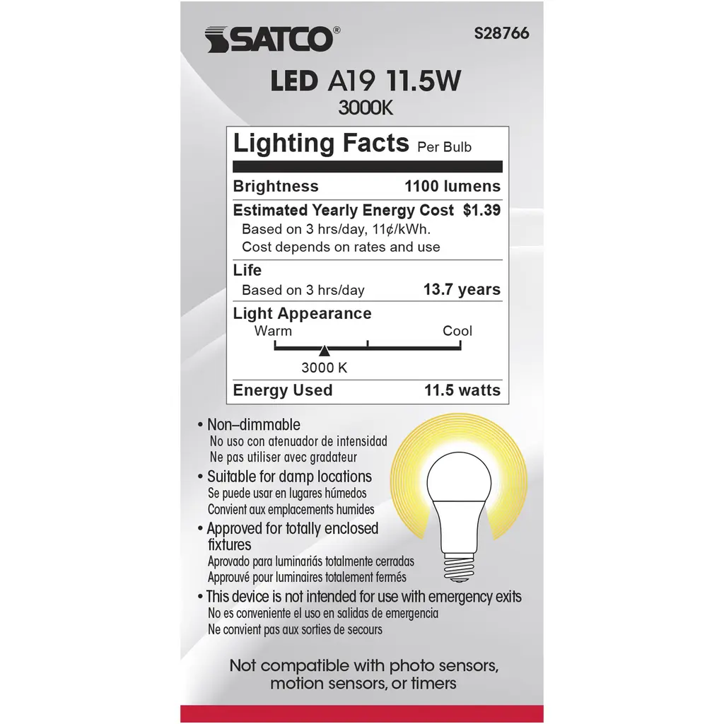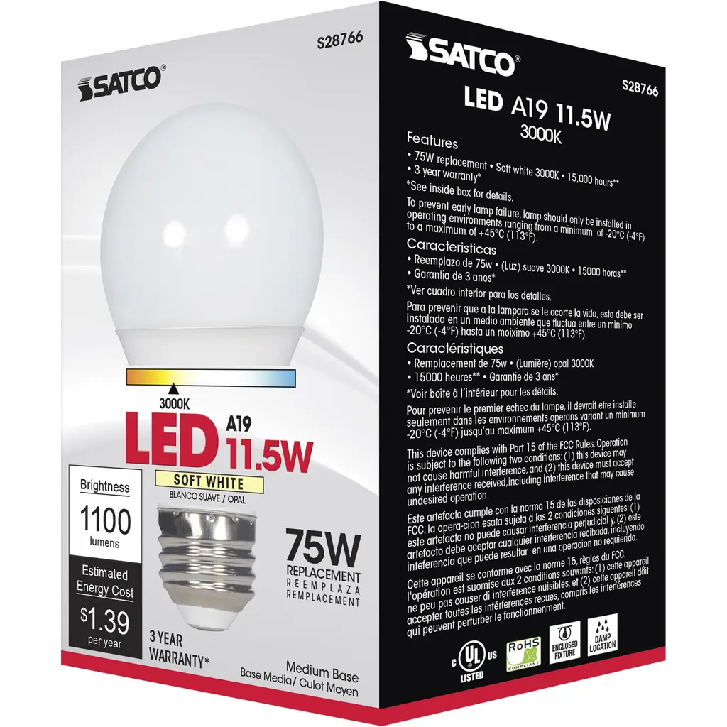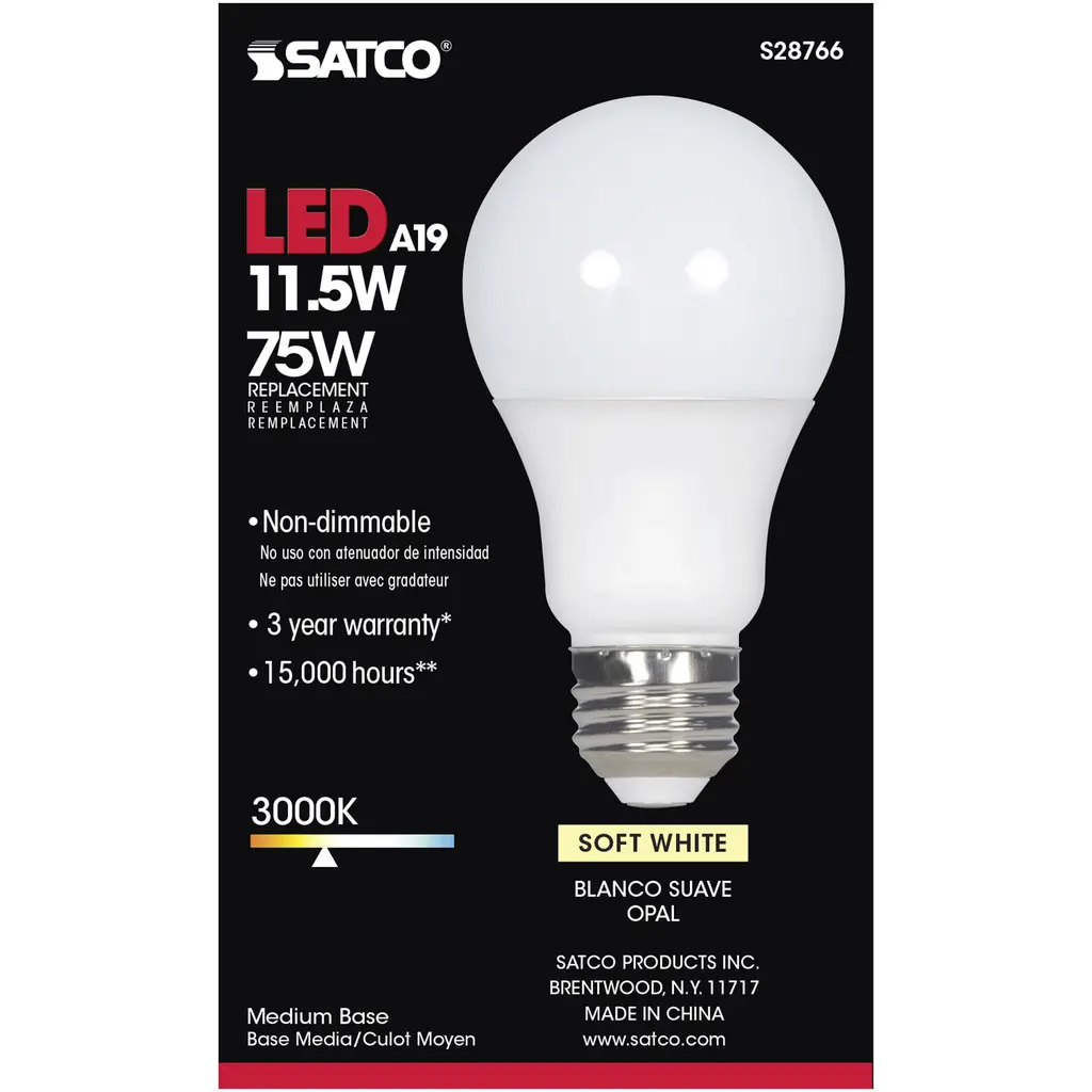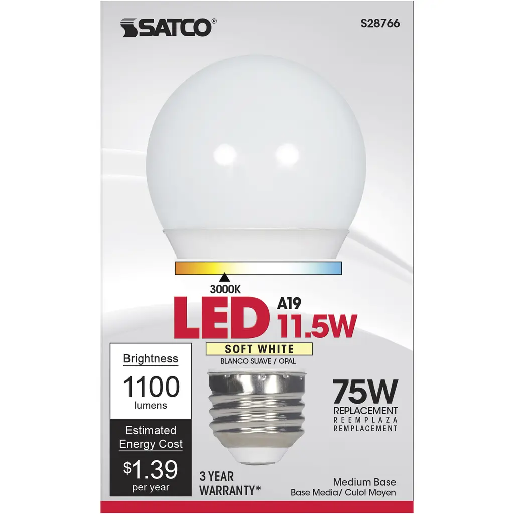 11.5W; A19 LED; 3000K; Medium base; 220 deg. beam spread;120V