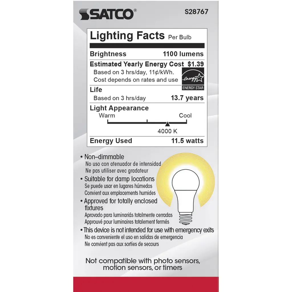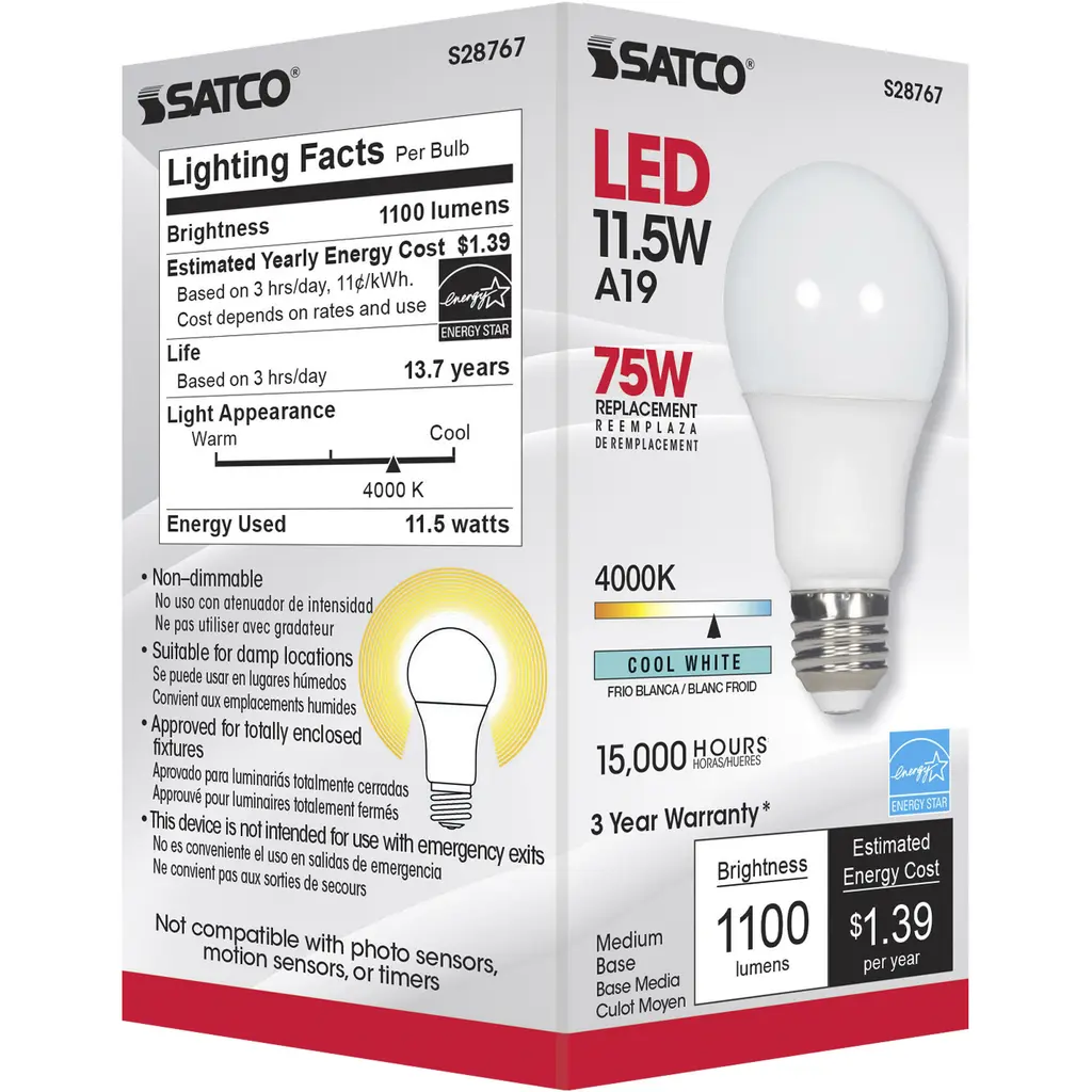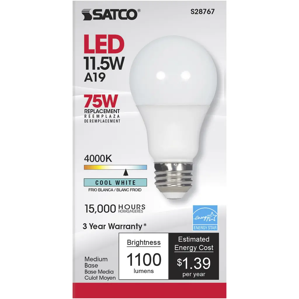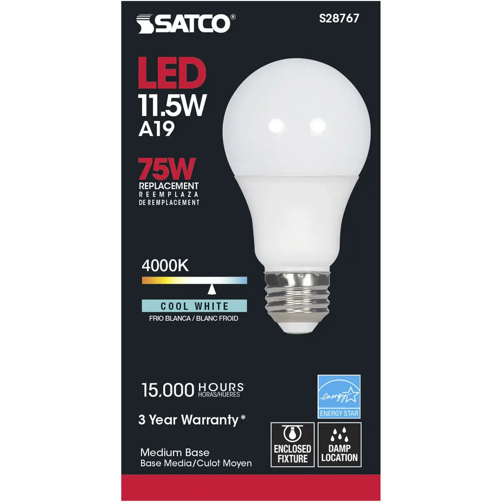 11.5W; A19 LED; 4000K; Medium base; 220 deg. beam spread;120V