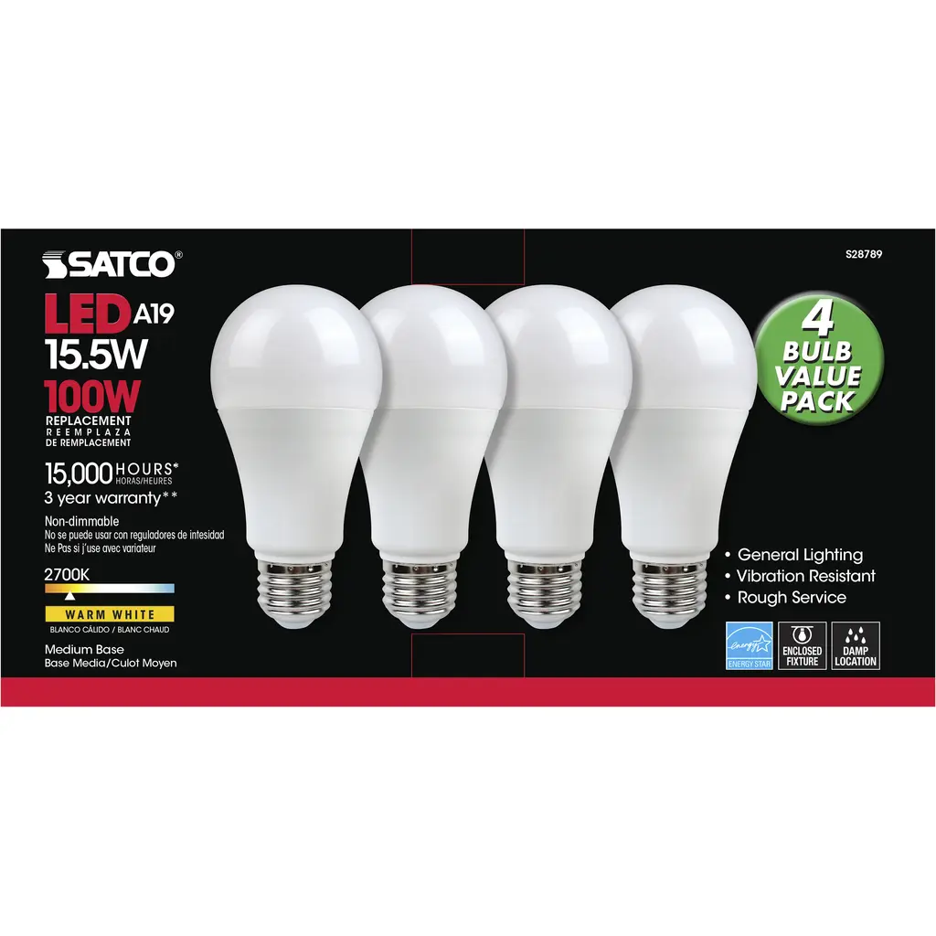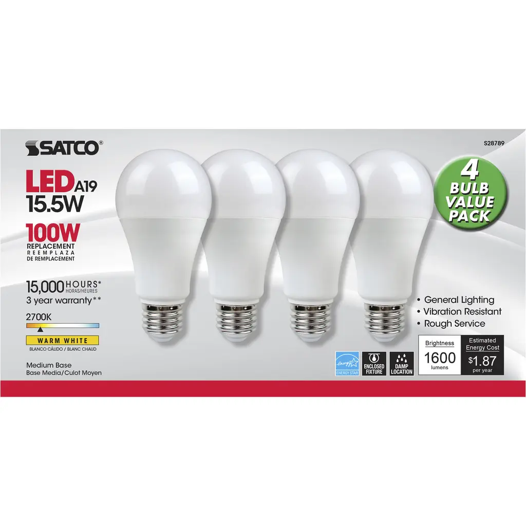 15.5W; A19 LED; 2700K; Medium base; 220 deg. beam spread;120V; 4-pack