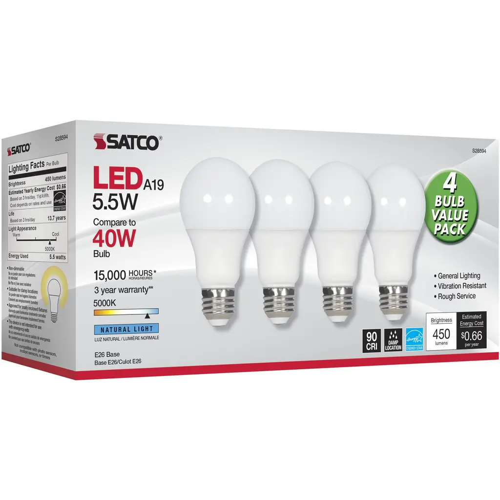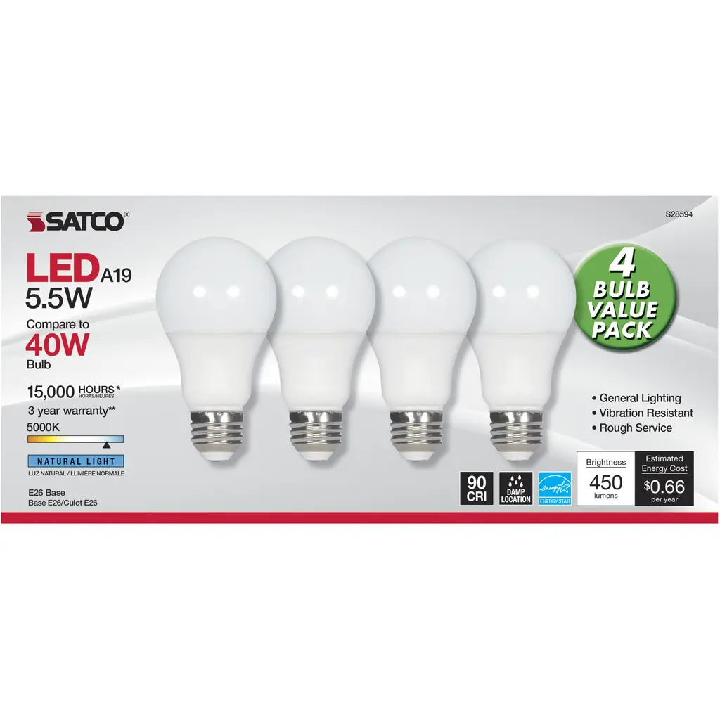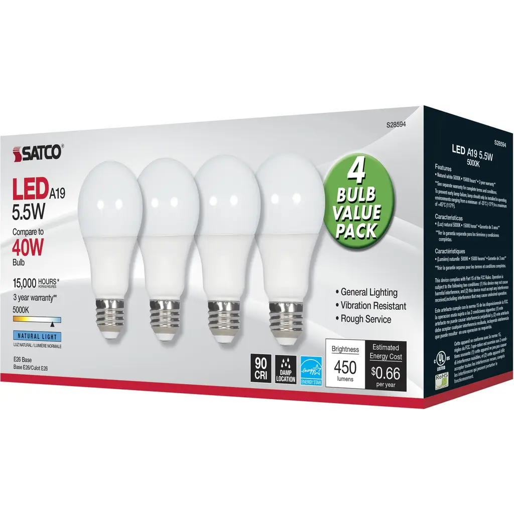 5.5W; A19 LED; Frosted; 5000K; Medium base; 120V; 4-pack