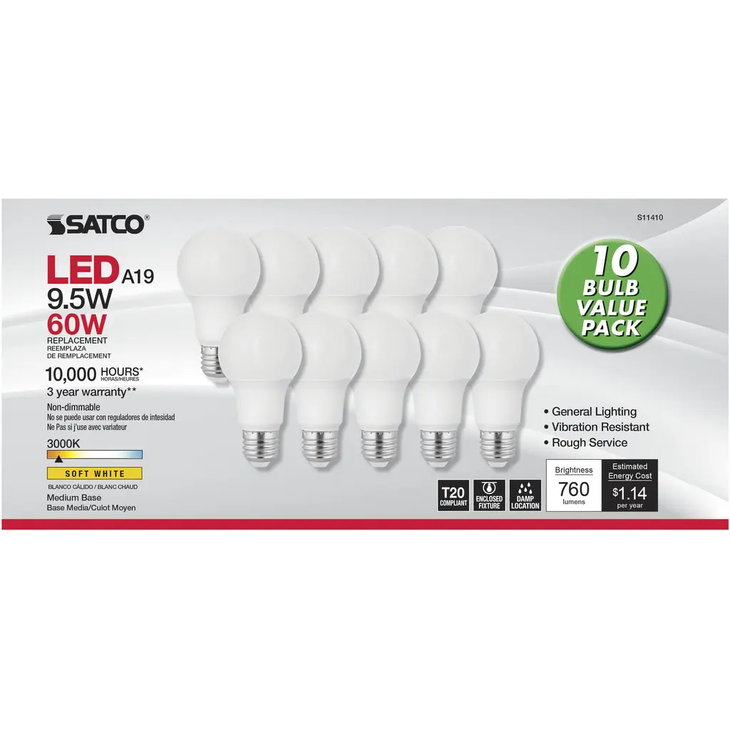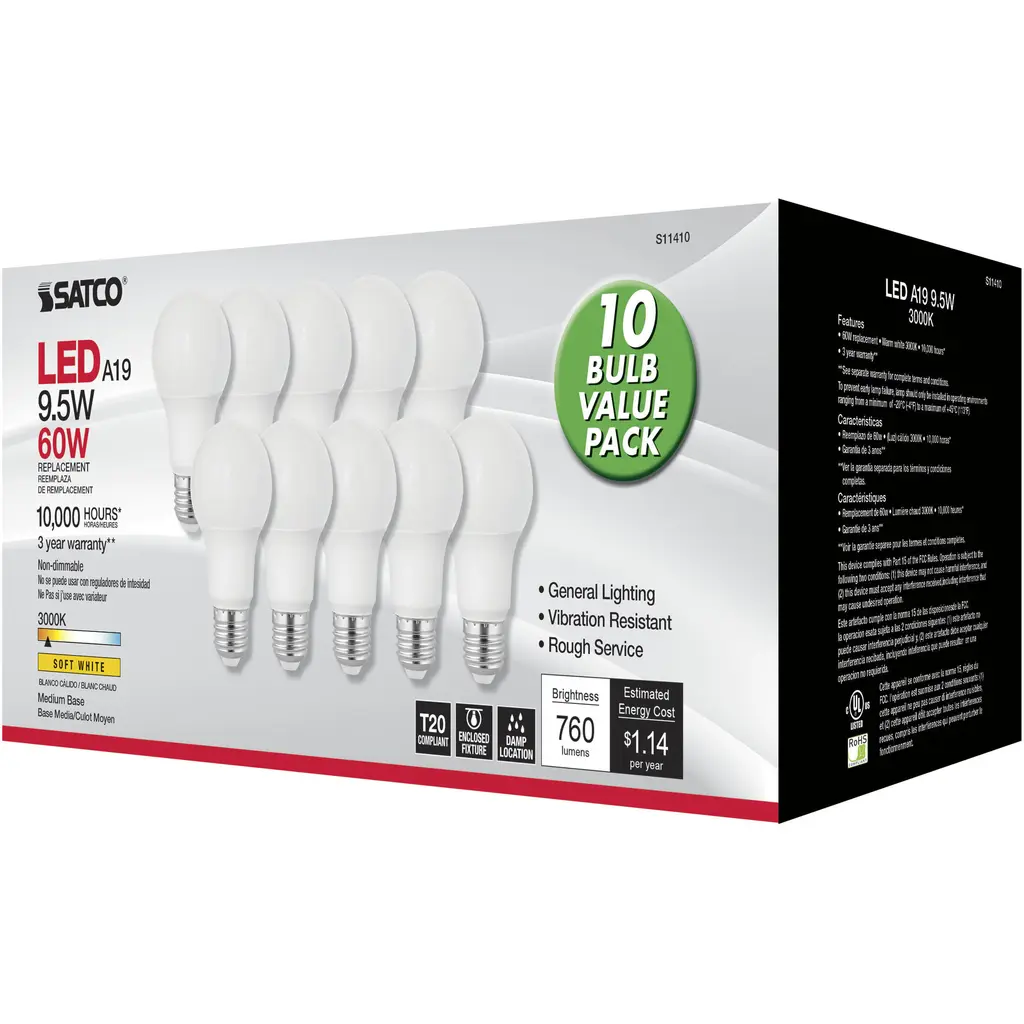 9.5 Watt A19 LED - 3000K - Medium Base - 220 Degree Beam Spread - 10-Pack