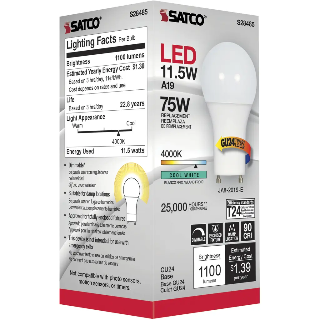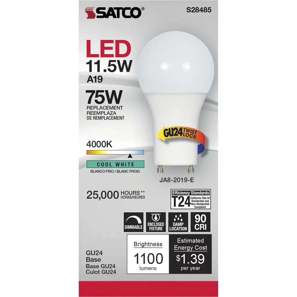11.5 Watt A19 LED Lamp - 90CRI 4000K GU24 Base - 220 Degree Beam Angle - 120 Volts 1100 Lumens CEC T20