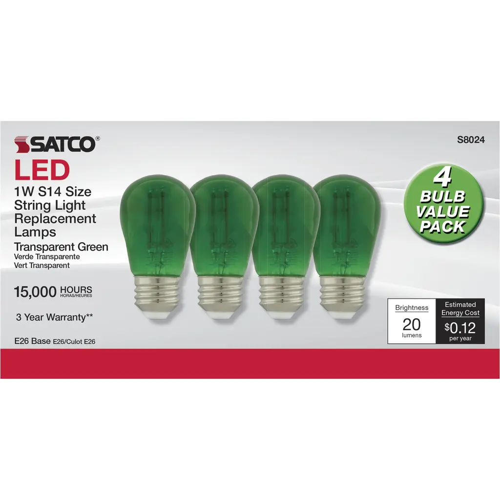 1 Watt - S14 LED Filament - Green Transparent Glass Bulb - E26 Base - 120 Volt - Non-Dimmable - Pack of 4