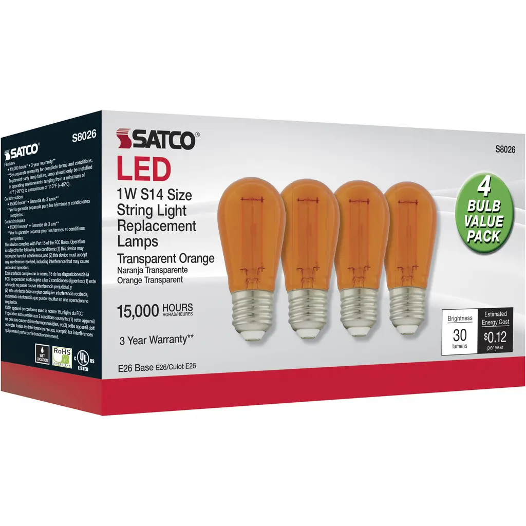 1 Watt - S14 LED Filament - Orange Transparent Glass Bulb - E26 Base - 120 Volt - Non-Dimmable - Pack of 4