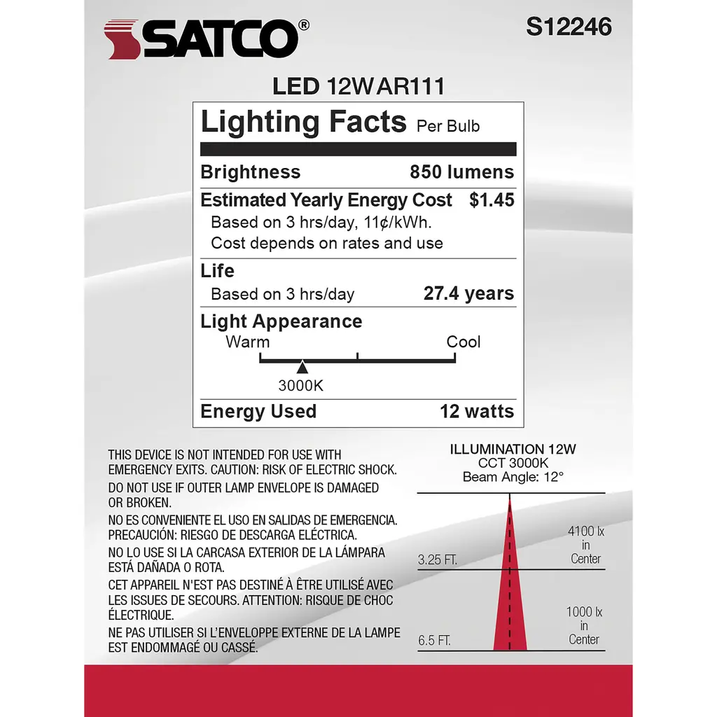 12 Watt - AR111 - COB LED - 850 Lumens - G53 Base - 80 CRI - 3000K - 12 Volt - 12 Degree Spotlight Bulb