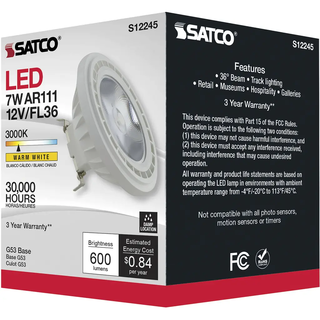 7 Watt - AR111 - COB LED - 600 Lumens - G53 Base - 80 CRI - 3000K - 12 Volt - 36 Degree Floodlight Bulb