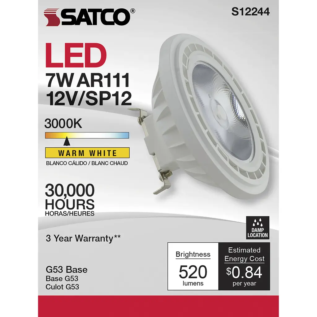 7 Watt - AR111 - COB LED - 520 Lumens - G53 Base - 80 CRI - 3000K - 12 Volt - 12 Degree Spotlight Bulb