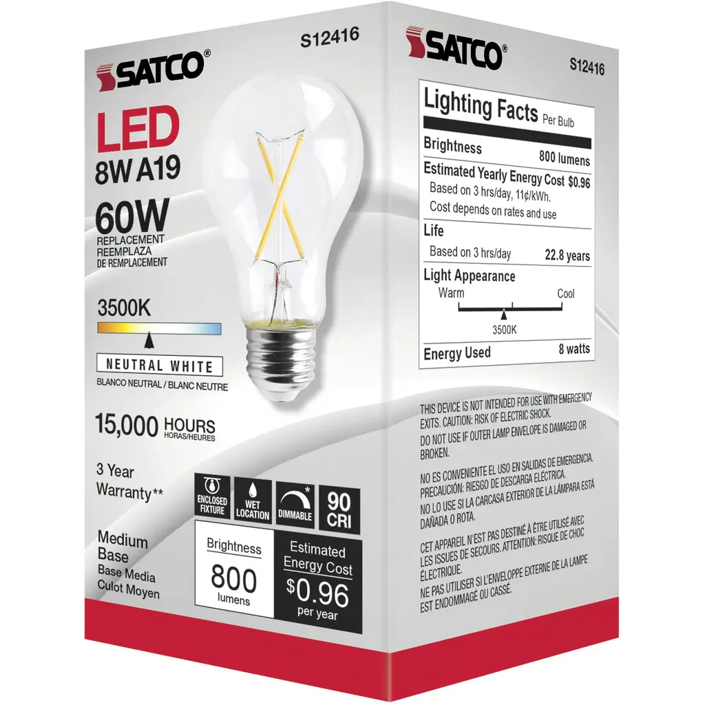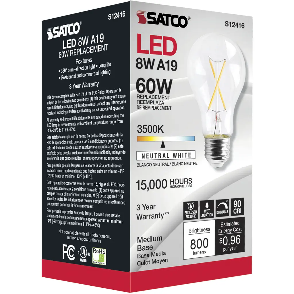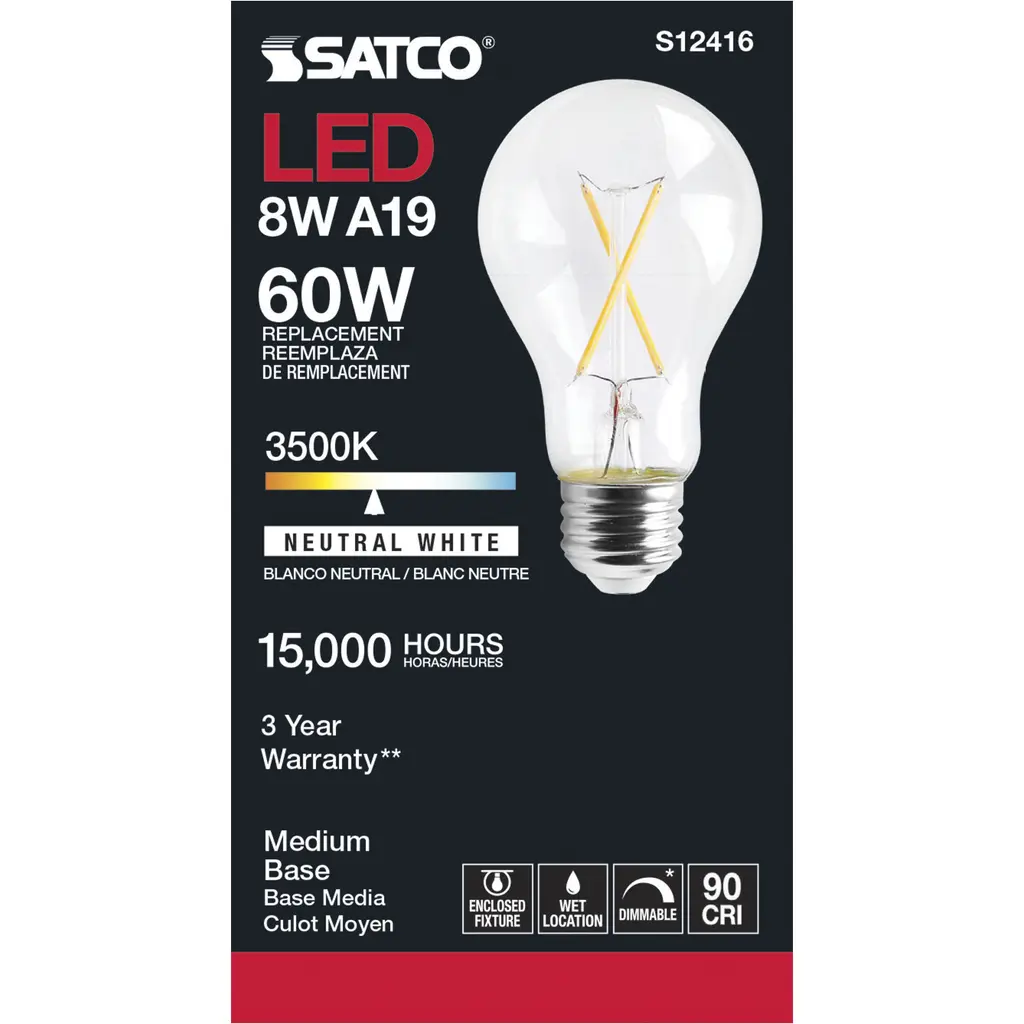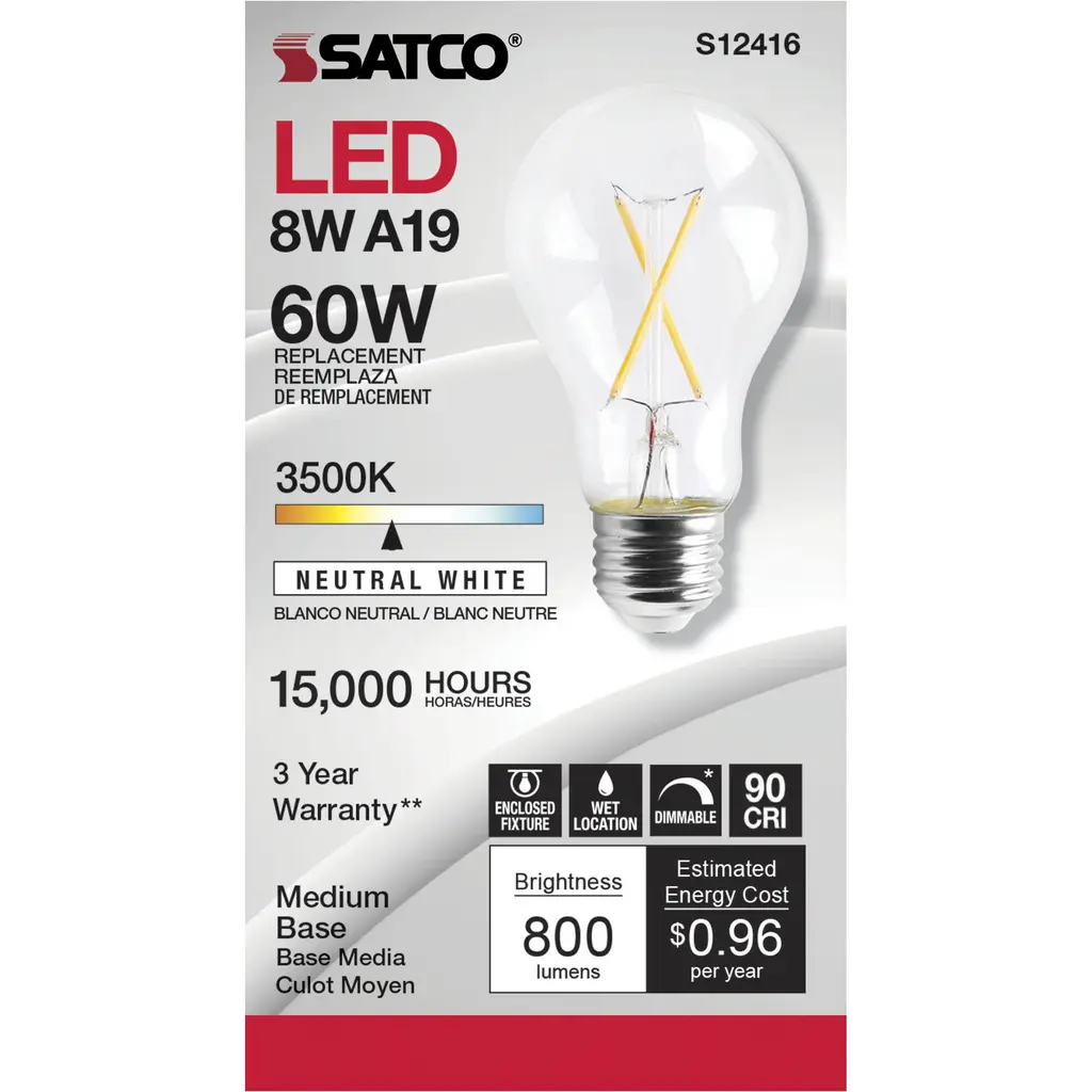 8 Watt LED A19 Lamp - Clear Medium Base 3500K 90 CRI 120 Volts