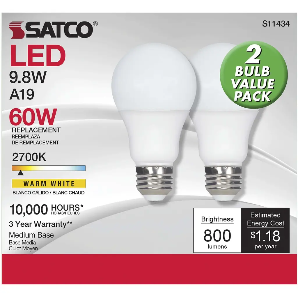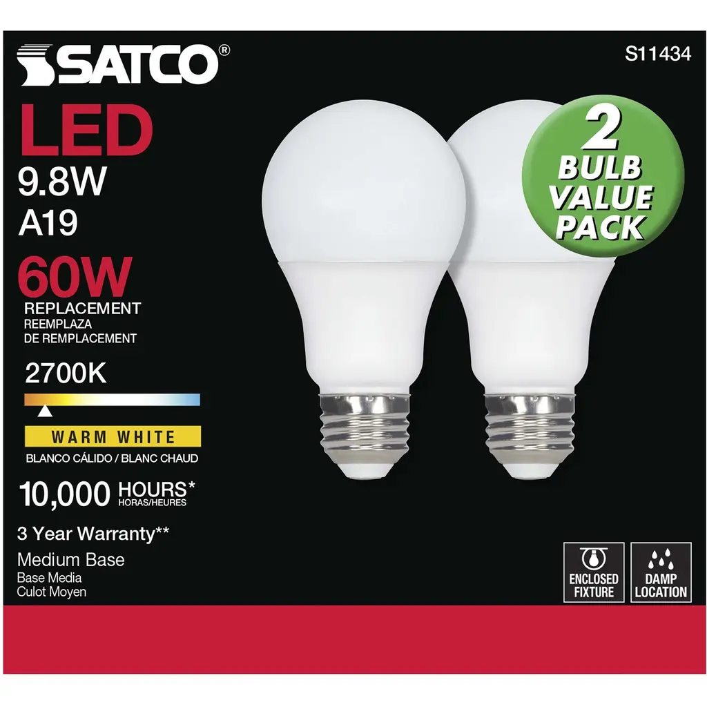 9.8 Watt A19 LED - 2700K - Medium Base - 220 Degree Beam Angle - 120 Volts - Pack of 2