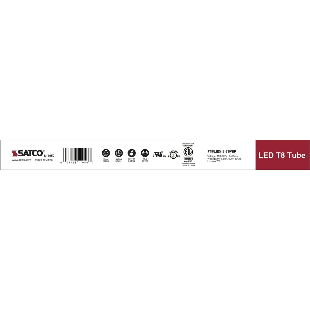7 Watt - 18 Inch - T8 Linear LED - Medium Bi-Pin G13 Base - 3000K - 50000 Average Rated Hours - 700 Lumens - Type B Ballast Bypass