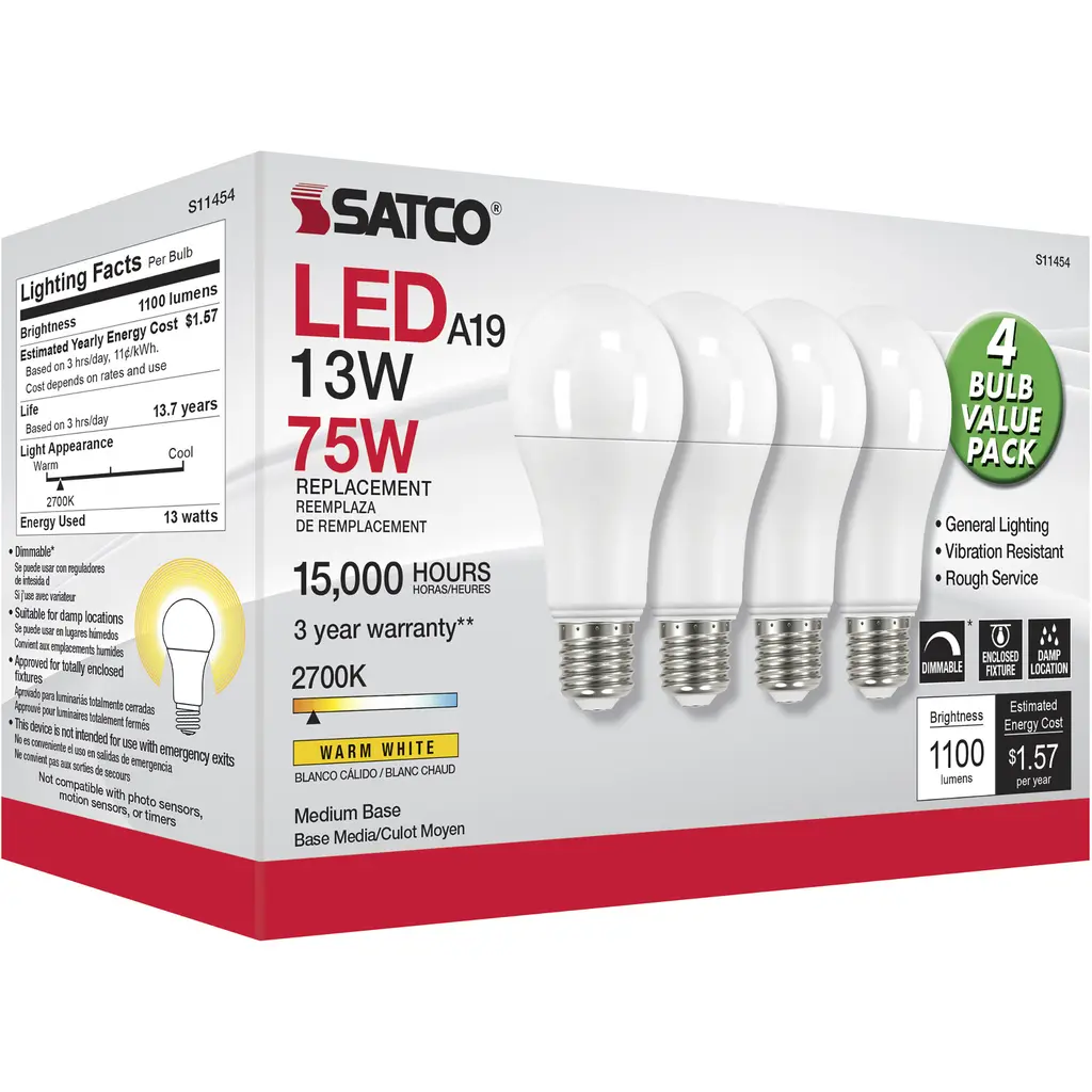 13 Watt A19 LED - 2700K - Dimmable - Medium Base - 230 Degree Beam Angle - 4-Pack