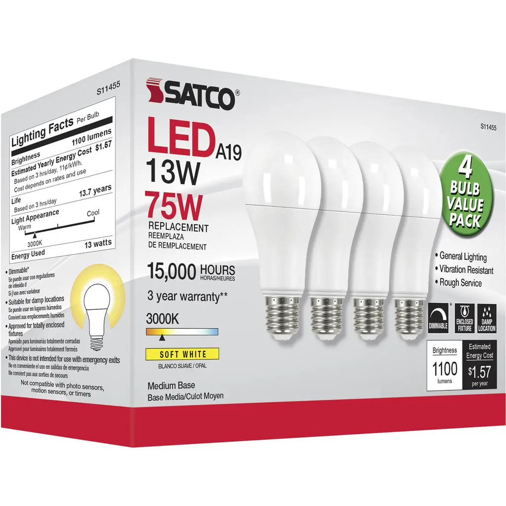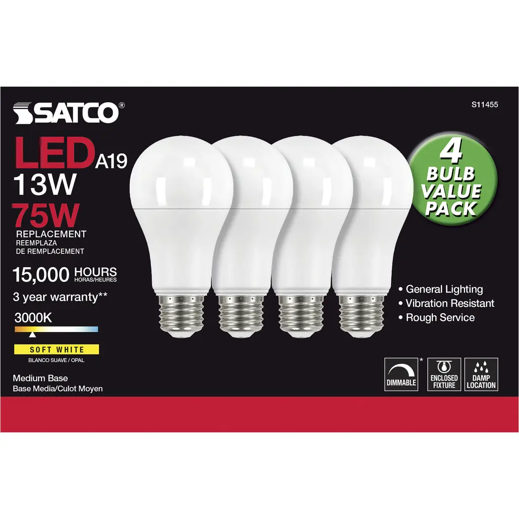 13 Watt A19 LED - 3000K - Dimmable - Medium Base - 230 Degree Beam Angle - 4-Pack