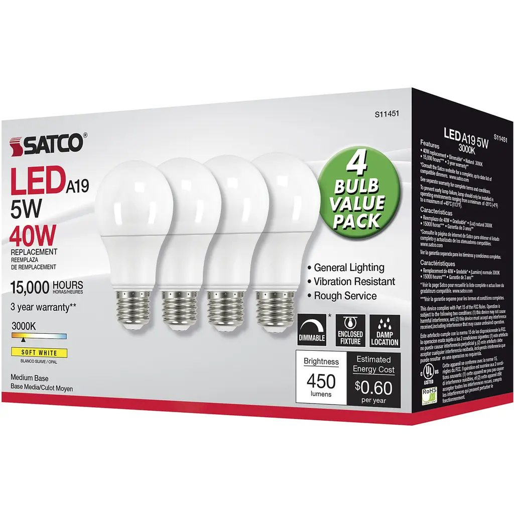 5 Watt A19 LED - 3000K - Dimmable - Medium Base - 230 Degree Beam Angle - 4-Pack
