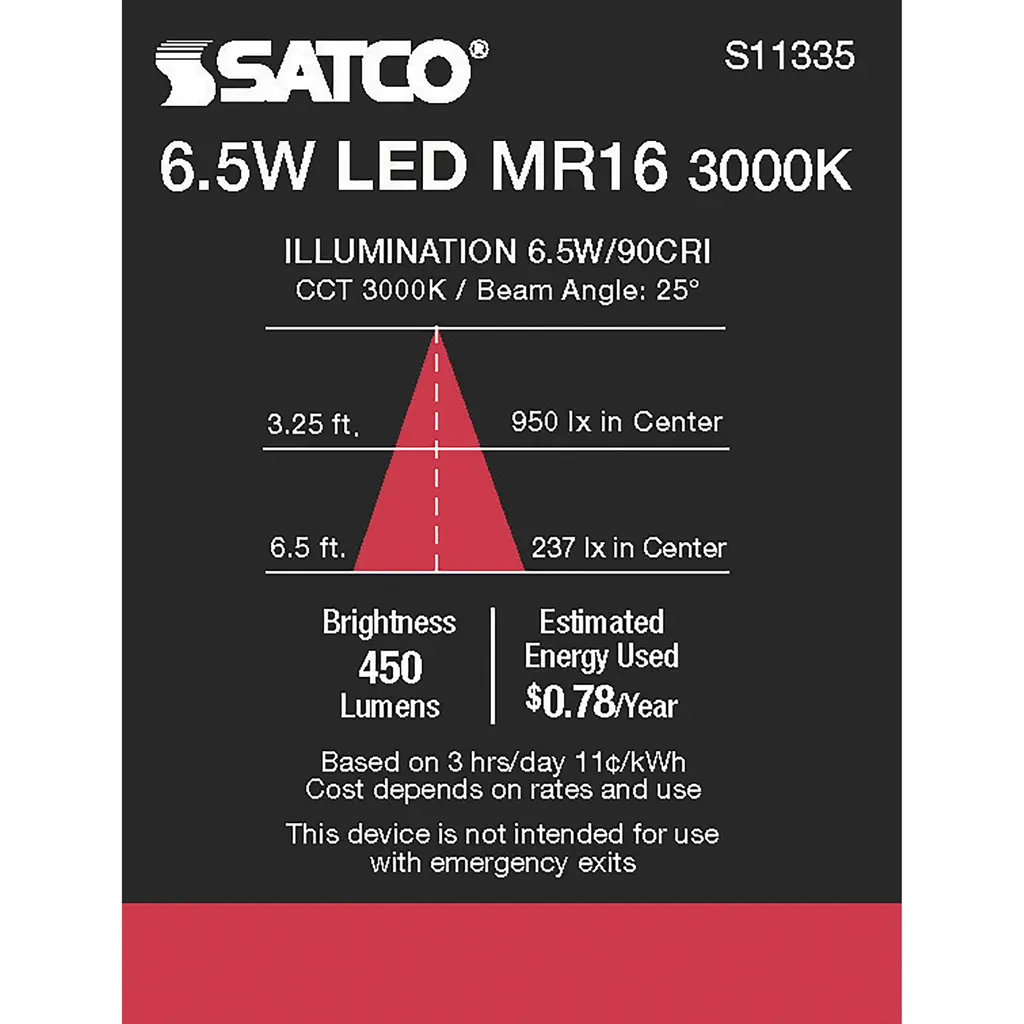 6.5 Watt MR16 LED Lamp - 3000K GU5.3 Base 25 Degree Beam Angle 12 Volts