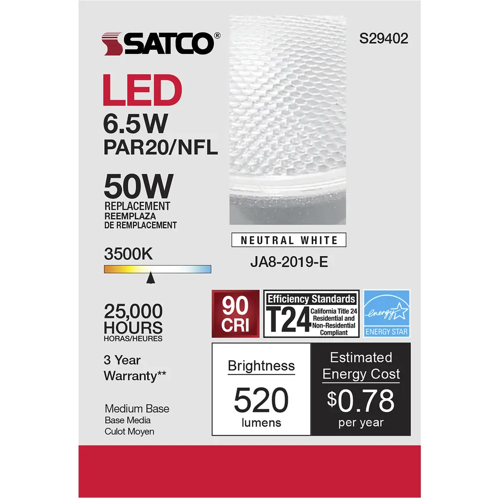 6.5 Watt PAR20 LED Lamp - 3500K - 25 Degree Beam Angle - Medium Base - 120 Volts