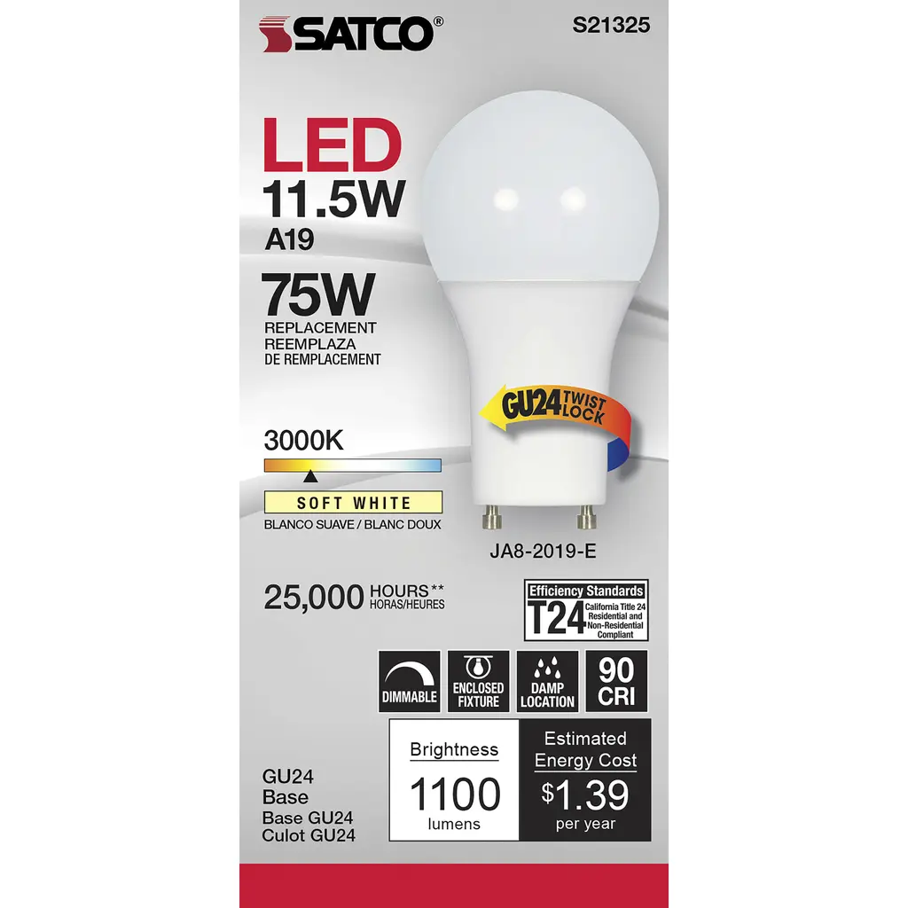 11.5W - A19 LED - 90CRI - 3000K - GU24 Base - 220 Degree Beam Angle - 120V - 1100L - CEC