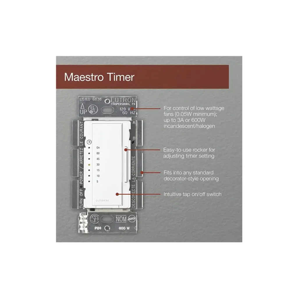 Save energy by using the Maestro Countdown Timer in closets, attics, basements, and other low-traffic areas to ensure a light or fan is never left on for a long time. Use the Maestro countdown timer switch on exhaust fans in places like bathrooms. Use the large tap switch to turn the timer on and off; use the rocker panel on the side to set the timer to the desired time-out option ranging from 5-60 minutes. Softly lit LEDs indicate the time remaining before turn-off. Complete the sleek look with a Lutron Claro screwless wall plate, sold separately.