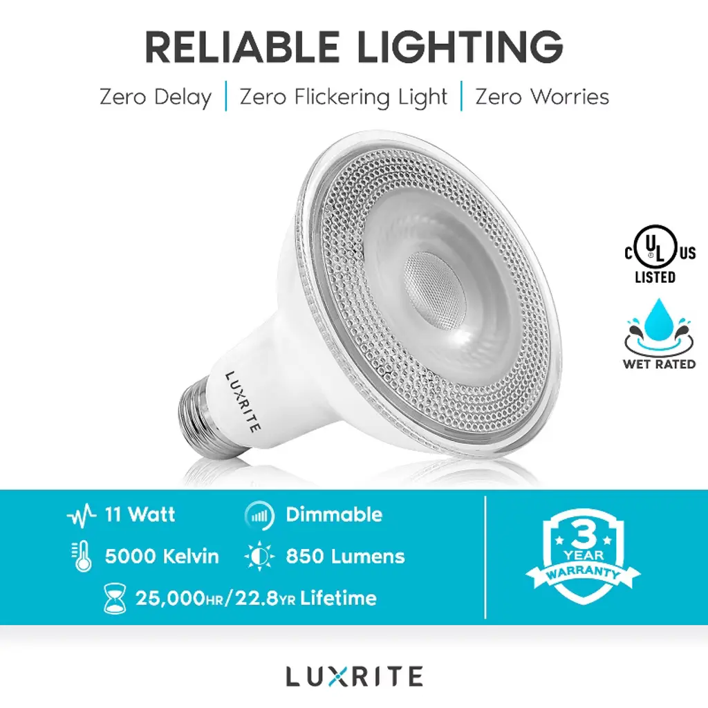 Luxrite PAR30 LED Flood Lighting - Enjoy energy efficient lighting in the exterior and interior of your home while still having better than standard quality light output. Each par30 flood light bulb only uses 11 watts of electricity but provides 850 lumens of vivid, colorful light which out classes traditional 75 watt incandescent light bulbs. With it's wet location rating, you can reliably use these in any space and not have to worry about the weather or conditions. You'll gain quality light not only in your interior but your exterior will provide continuous light without issue. Control the look of your space with it's smooth dimming feature which can go from 100% to 10%, making your home more enjoyable at any time of the day. Not only will these LED light bulbs cut your costs by 85% but they come UL listed so you know you are getting the best in indoor and outdoor lighting. With it's durable construction, you can use these in any area with full confidence. Apply these lights to your soffit, eave, patio, garage, basement, recessed cans, indoors, outdoors, and more. Make the switch today to energy saving light bulbs which offer zero delay, zero flickering, and zero worries.