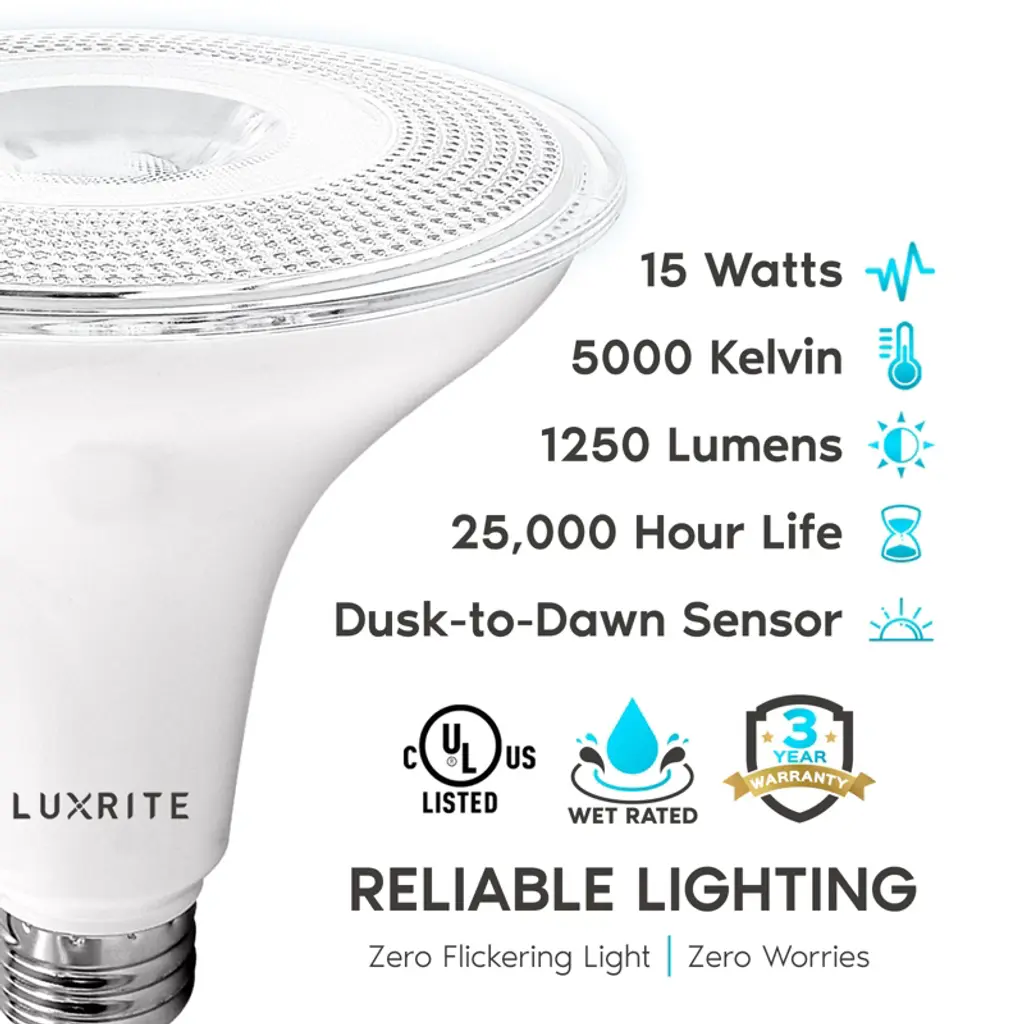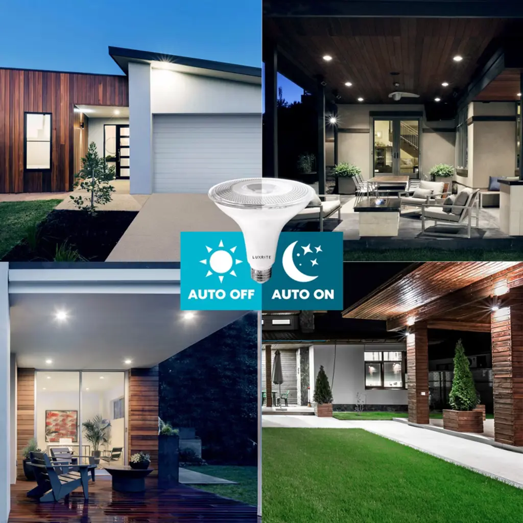 Luxrite Dusk to Dawn Light Bulbs - Enjoy a convenient way to brighten the exterior of your home with dusk to dawn light bulbs which automatically turn on and off depending on the time of day. Even when you are not home, these lights will turn on when it gets dark and illuminate the area. No hands on action is necessary, allowing it to conserve energy when needed. Not only will you save from the automatic sensing feature but they only use 15W of power comparable to a 90W incandescent bulb. Featuring a wet location rating, these can come in contact with rain and water and still produce continuous light without interruption. These are a reliable choice for outdoor lighting in your patio, porch, front yard, back yard, garage, security floodlight fixtures, driveways, and more!