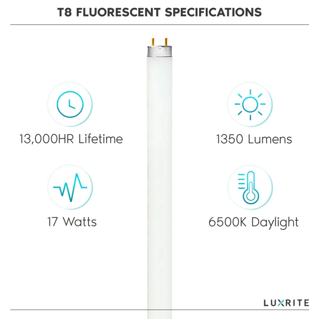 T8 Fluorescent Light Bulb - 24 Inch F17T8/765 - G13 Medium Base Luxrite T8 Fluorescent Bulb Uses 75% less energy then equivalent incandescent lamps. It has a long life of 13,000 Hours and it works with all G13 medium bi-pin sockets. Similar replacement to Goodlite G-10723 F17T8/765/ECO, Triangle Bulbs F17T8/765.