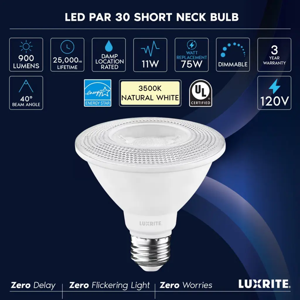 Luxrite PAR30 LED Short Neck Flood Lighting - Enjoy energy efficient lighting in the exterior and interior of your home while still having better than standard quality light output. Each par30s flood light bulb only uses 11 watts of electricity but provides 900 lumens of vivid, colorful light which out classes traditional 75 watt halogen light bulbs. With it's damp location rating, you can reliably use these in any indoor and covered outdoor space. Gain quality light not only in your interior but your exterior will provide continuous light without issue. Control the look of your space with it's smooth dimming feature, making your home more enjoyable at any time of the day. Not only will these LED light bulbs cut your costs by 85% but they come Energy Star and UL listed so you know you are getting the best in indoor and outdoor lighting. With it's durable construction, you can use these in any area with full confidence. Apply these lights to your soffit, eave, patio, garage, basement, recessed cans, and more. Make the switch today to energy saving light bulbs which offer zero delay, zero flickering, and zero worries.